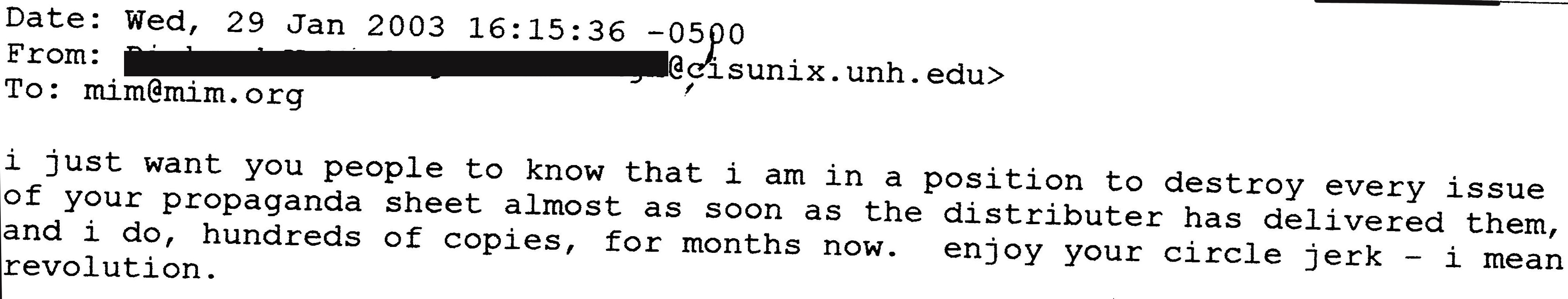 | University of New Hampshire, Durham | 2 | N | Tax-funded administrator yahoo wrote to tell us he throws out MIM Notes. | ||||||||||