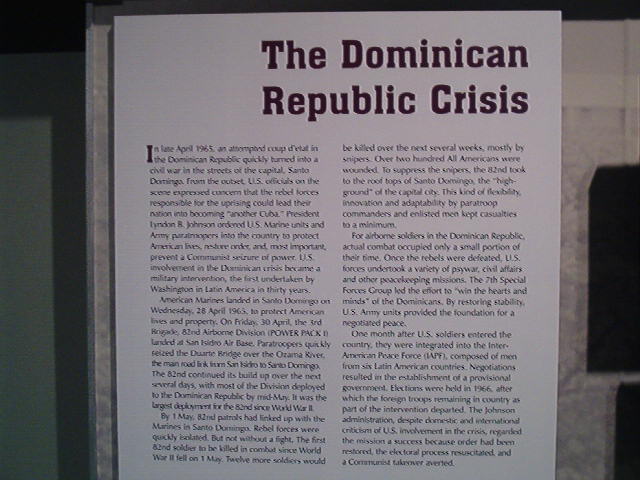 The 82nd Airborne had its biggest assignment since World War II in the Dominican Republic in 1965. The exhibit omits that the united $tates was overthrowing the elected president of the Dominican Republic and calls resistance to u.$. puppets a "coup" attempt. Through this occupation, Uncle $am twisted the arms of the Dominican Republic to vote for a candidate deemed even more pro-Amerikan than the milquetoast reformer they were calling a secret "communist."
