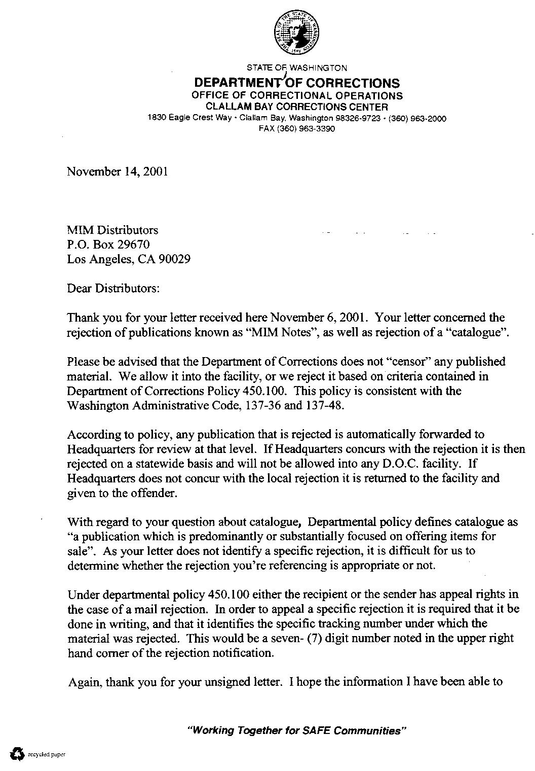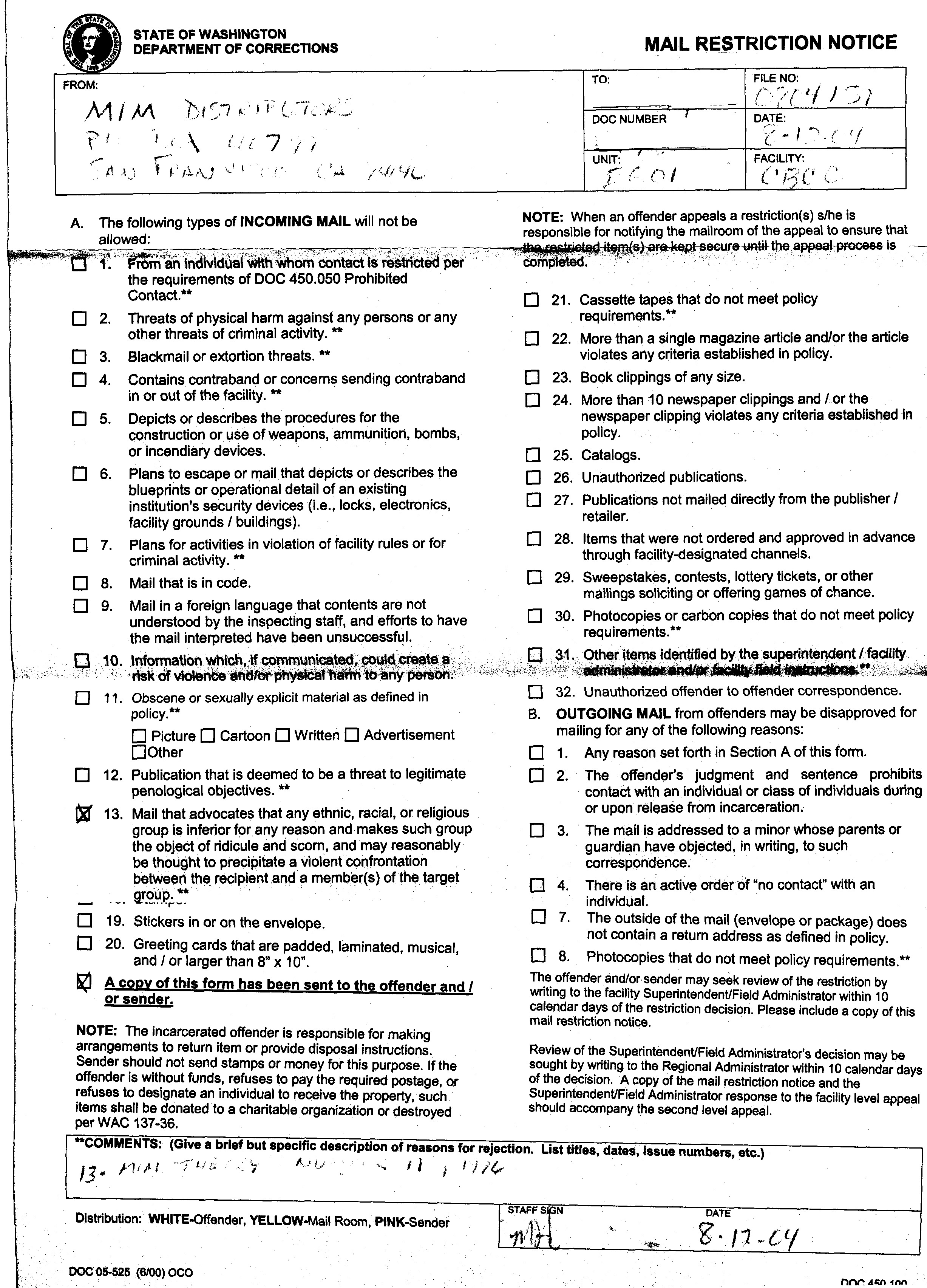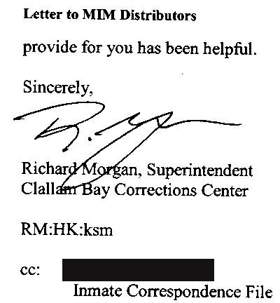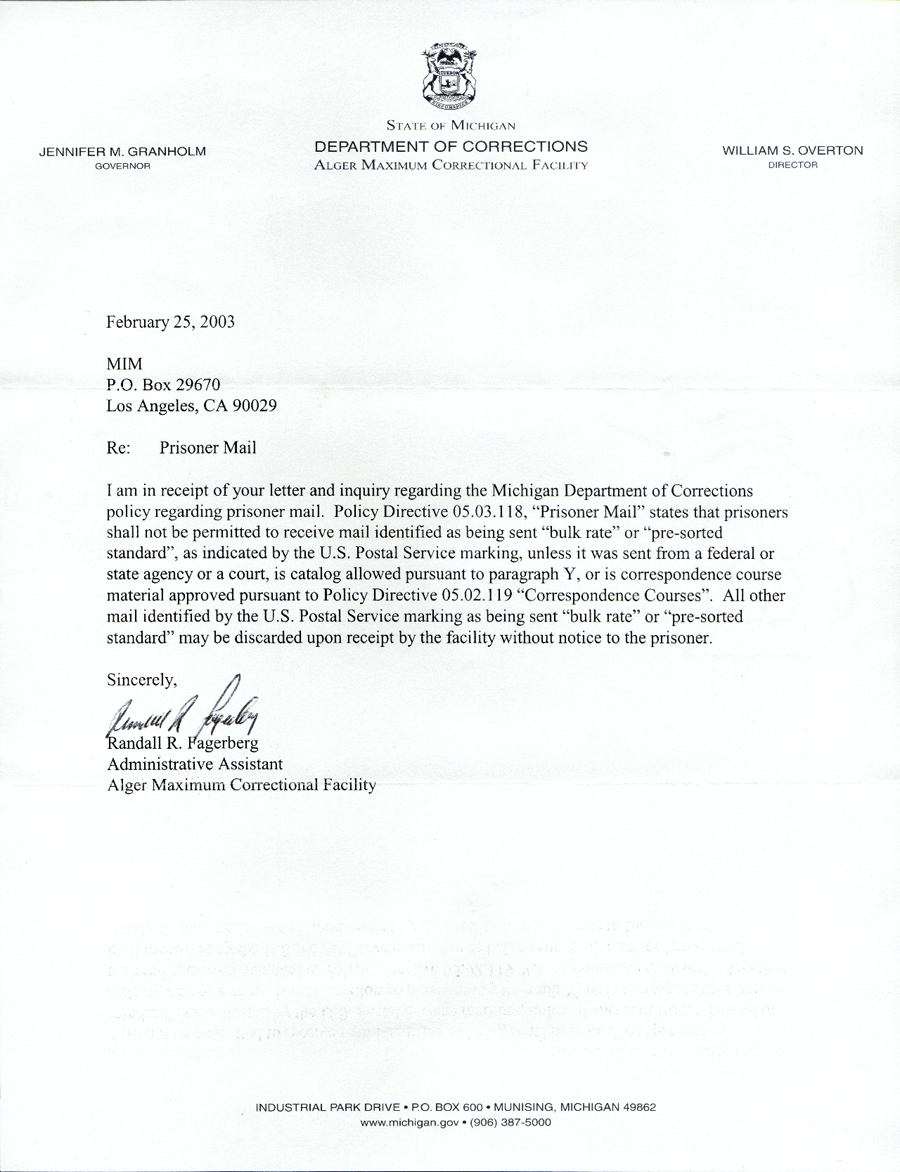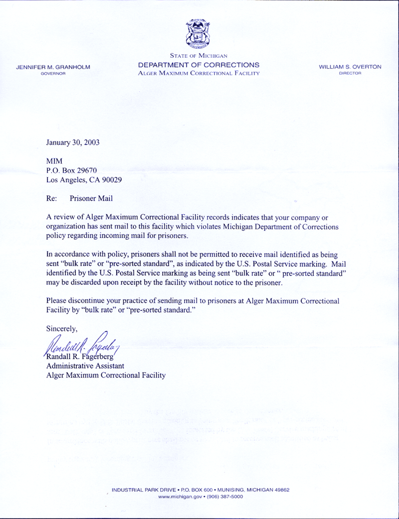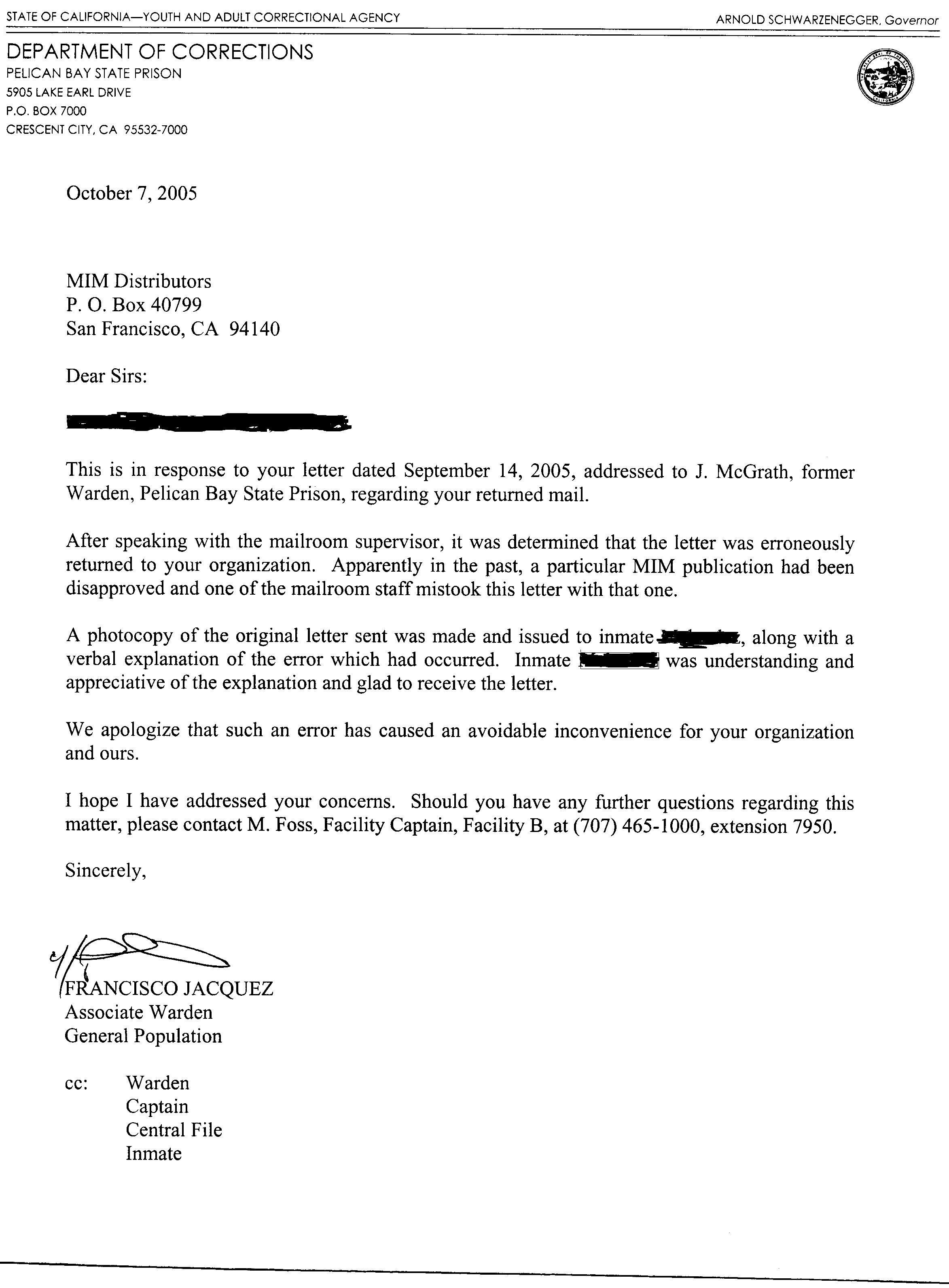 California, December 22, 2006 Pelican Bay cites deputy director Scott Kernan as banning all MIM correspondance
