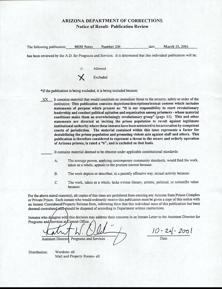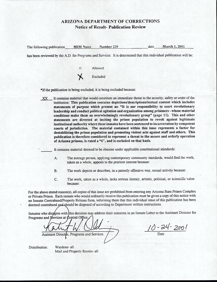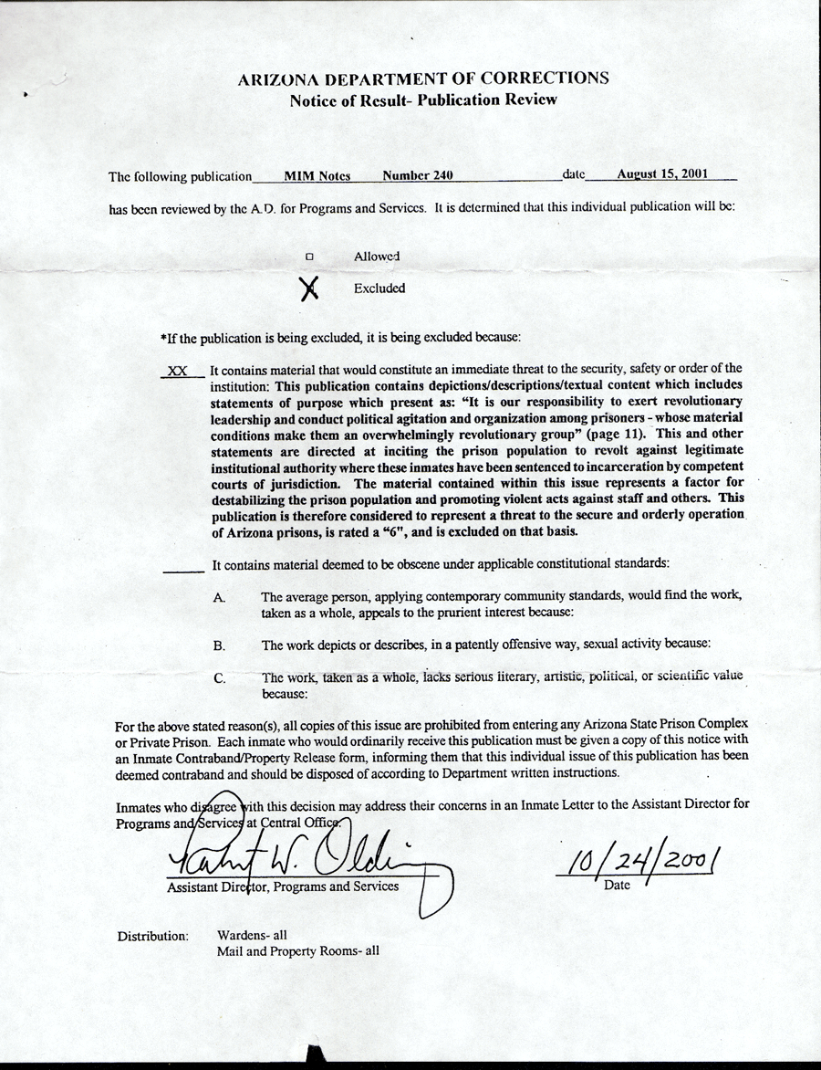 Arizona, October 24, 2001 Arizona prison bans MIM Notes 229 (600k)