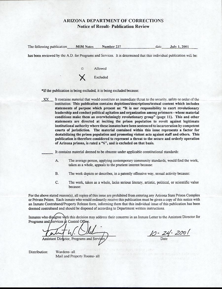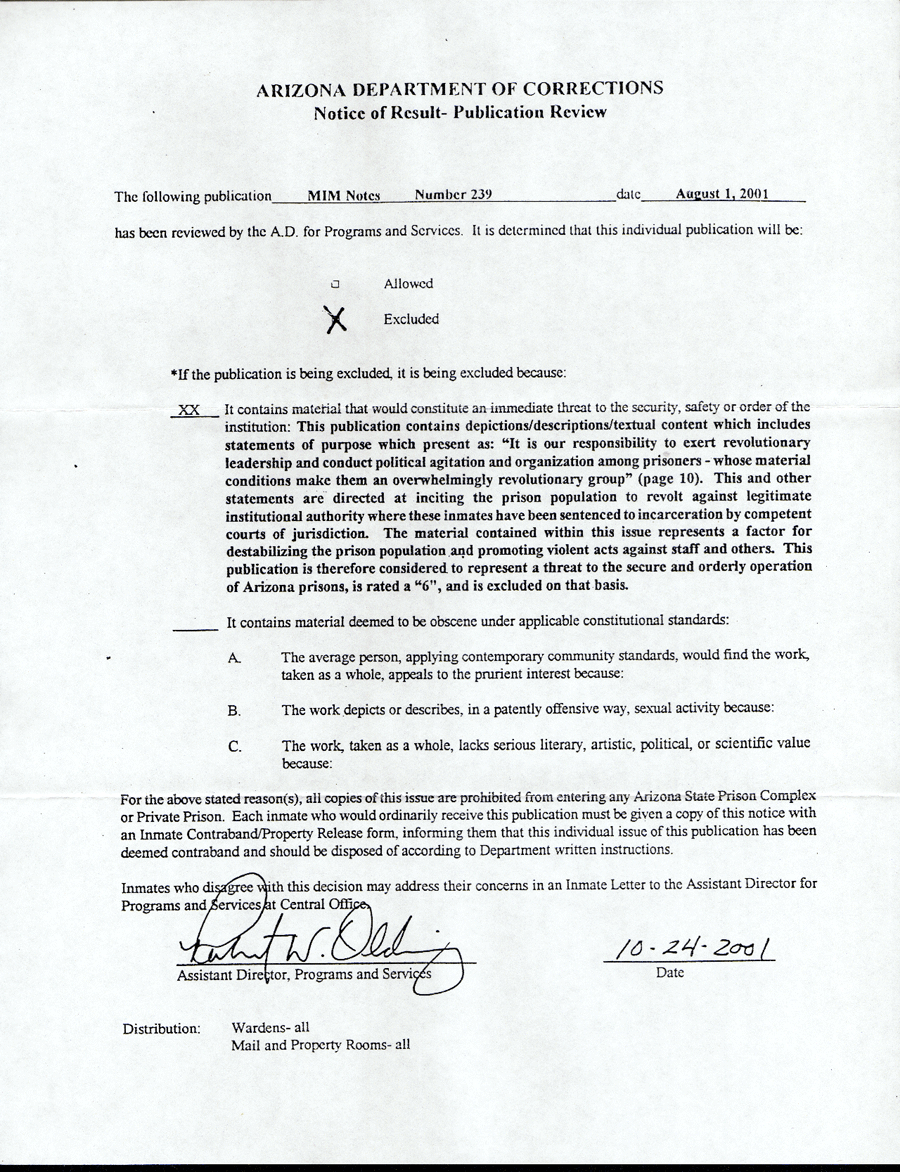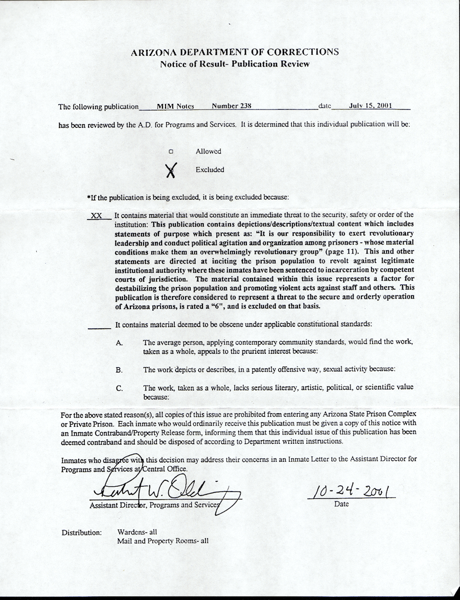 Arizona, October 2, 1998 Arizona prison bans MIM Notes (600k)