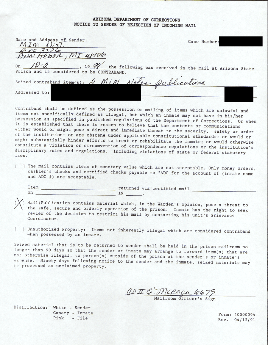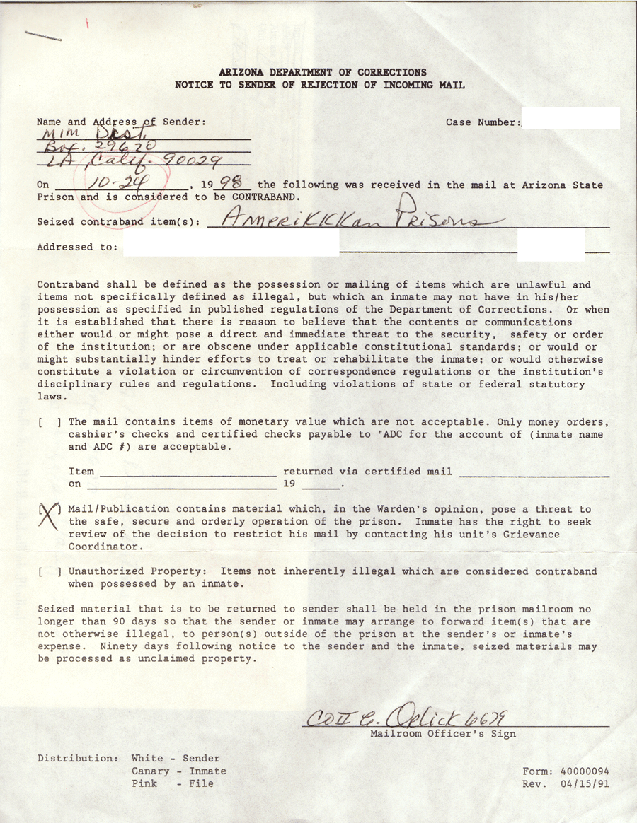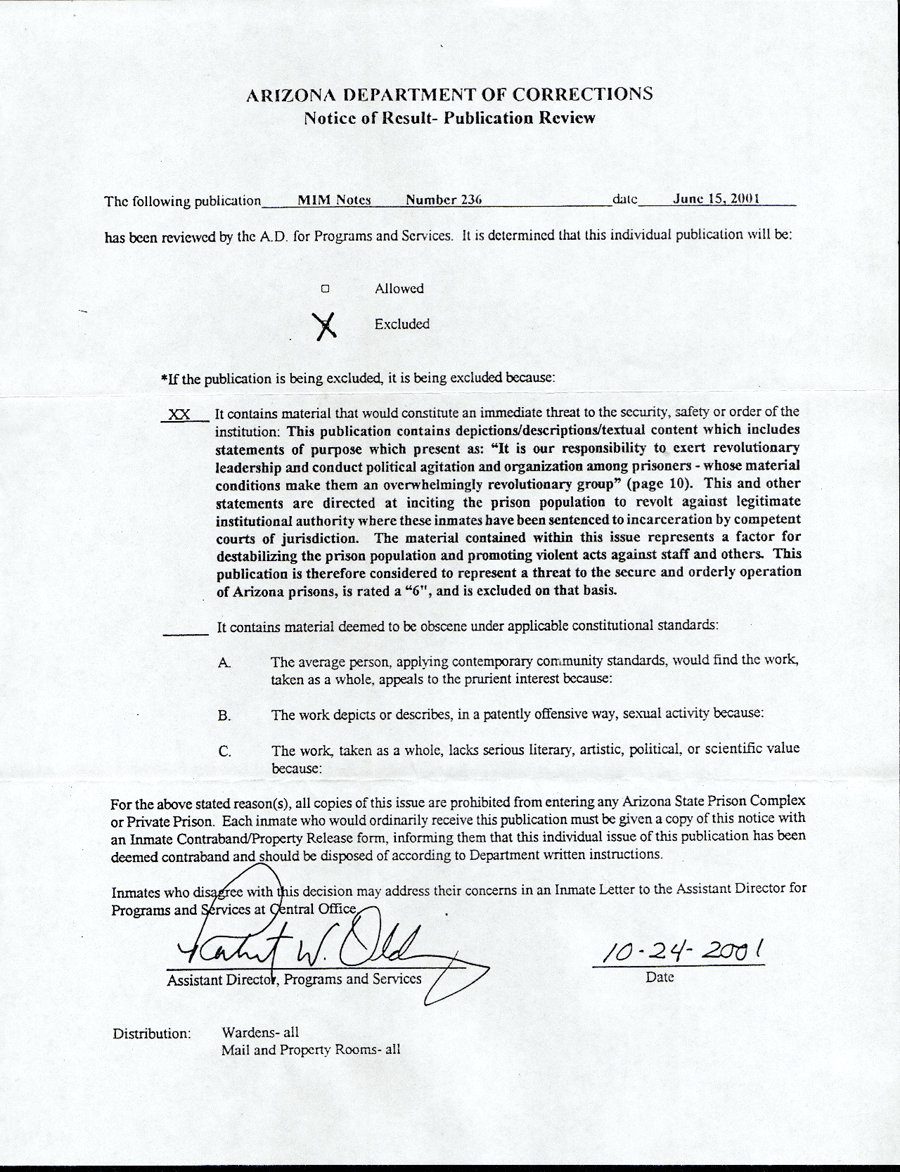 Arizona, October 2, 1998 Arizona prison bans MIM Notes (600k)
