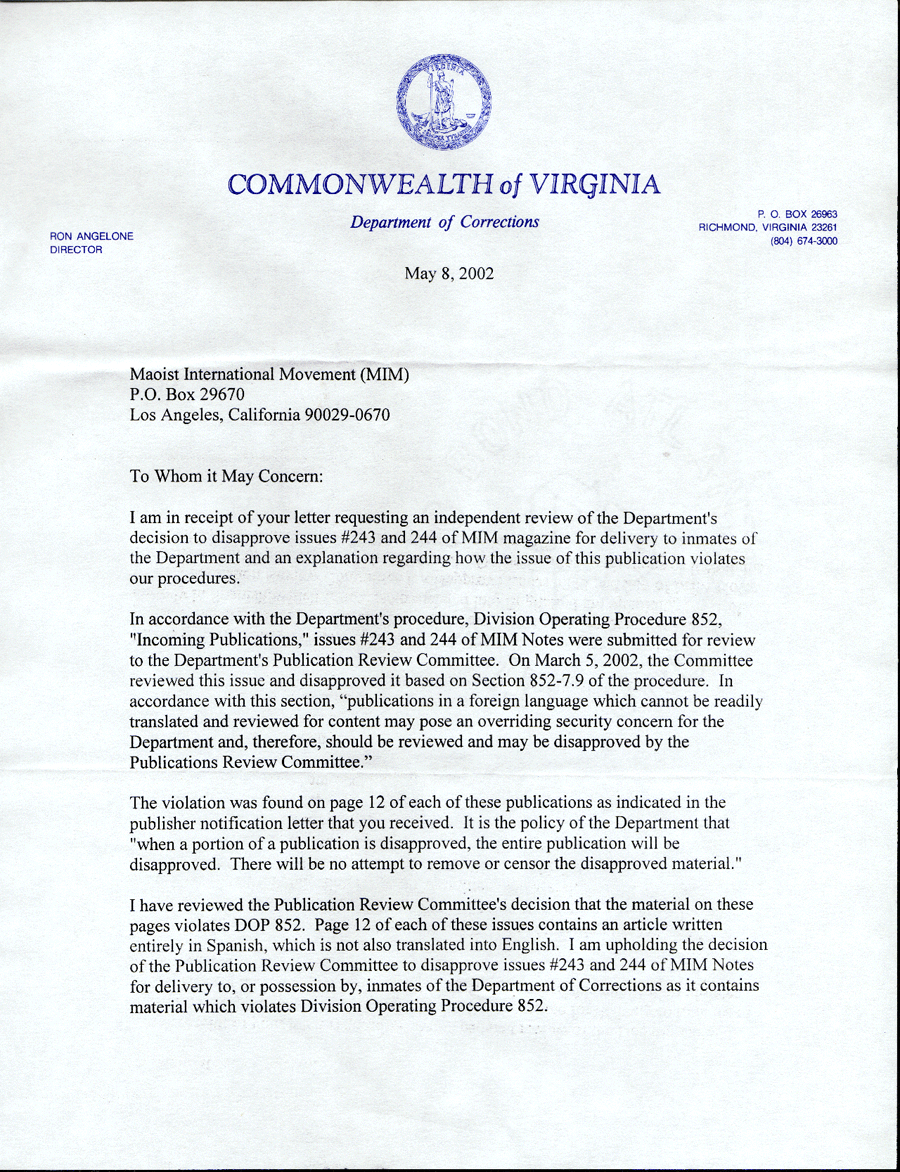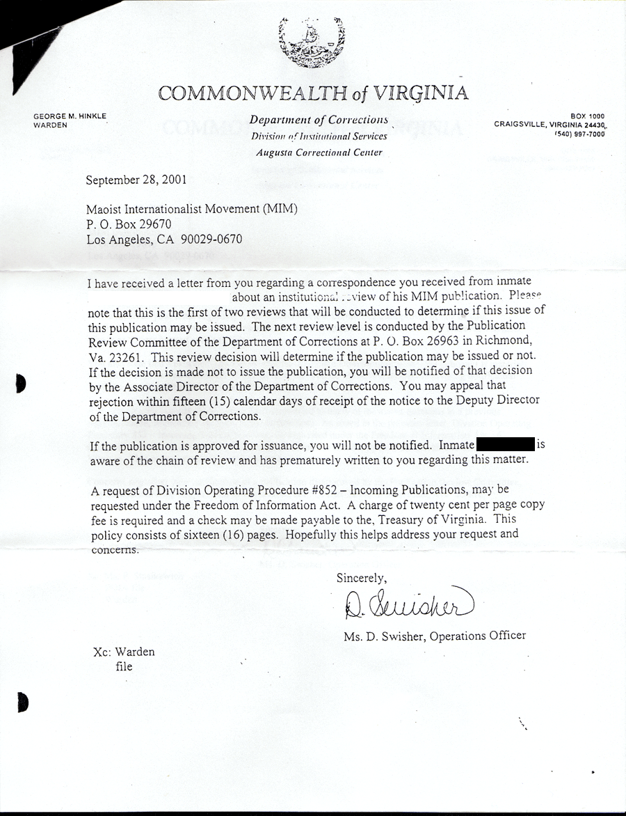 Virginia, August 2, 1999 Red Onion State Prison says MIM not on approved list of publications