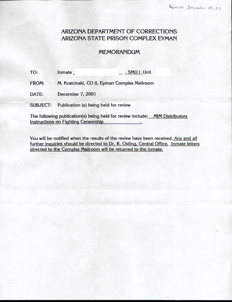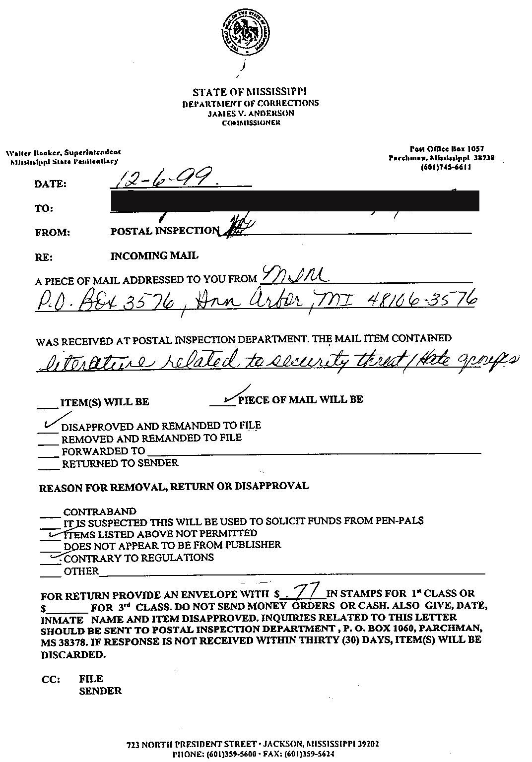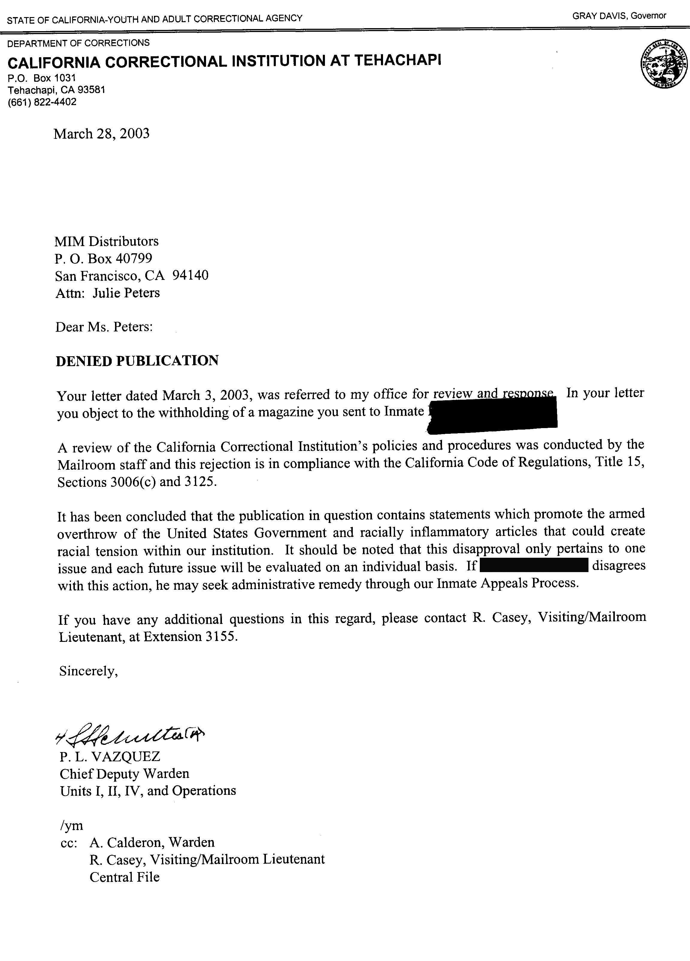 California, December 8, 2003 CSATF warden justifies censorship of MIM for "security reasons" (page 1 of 2)