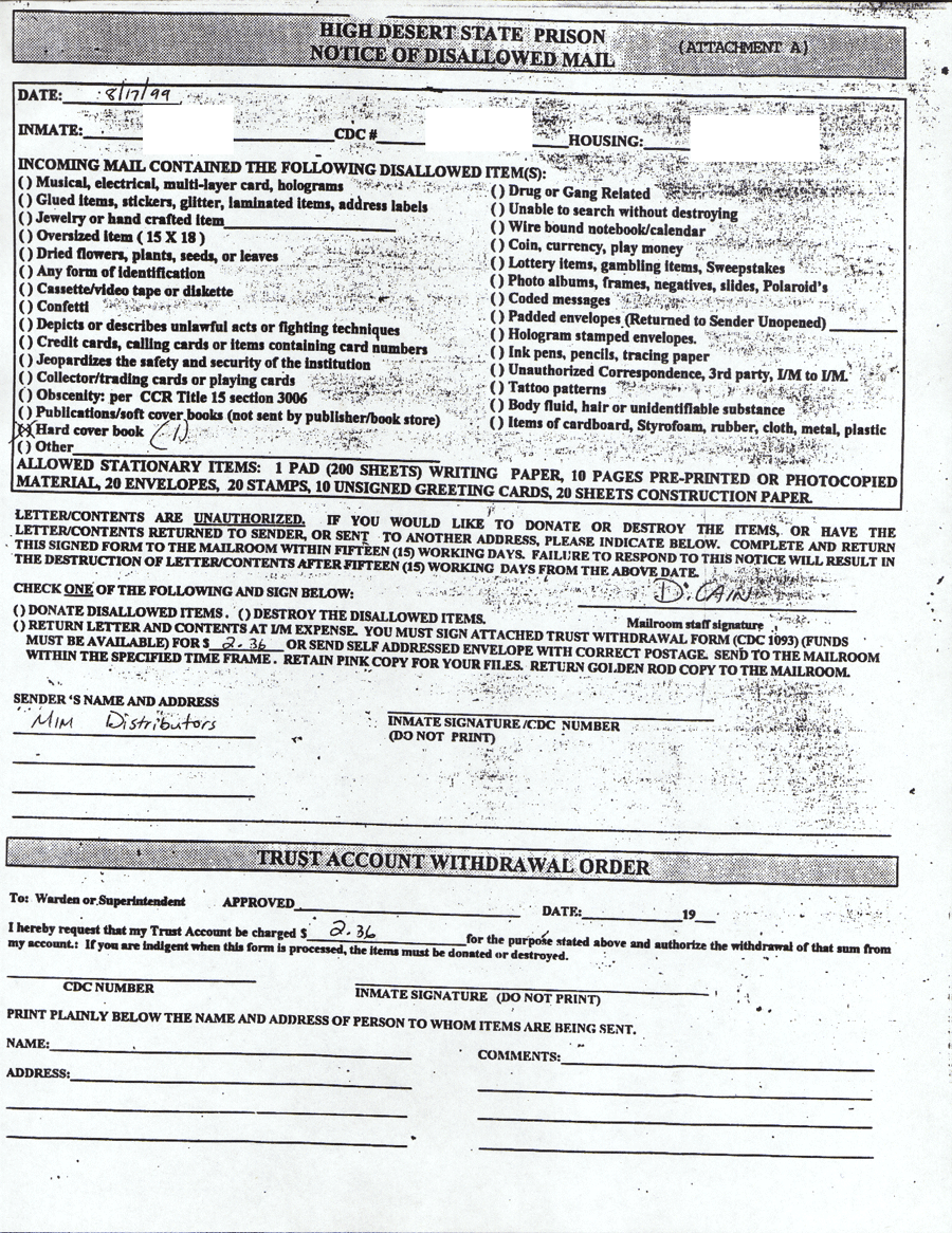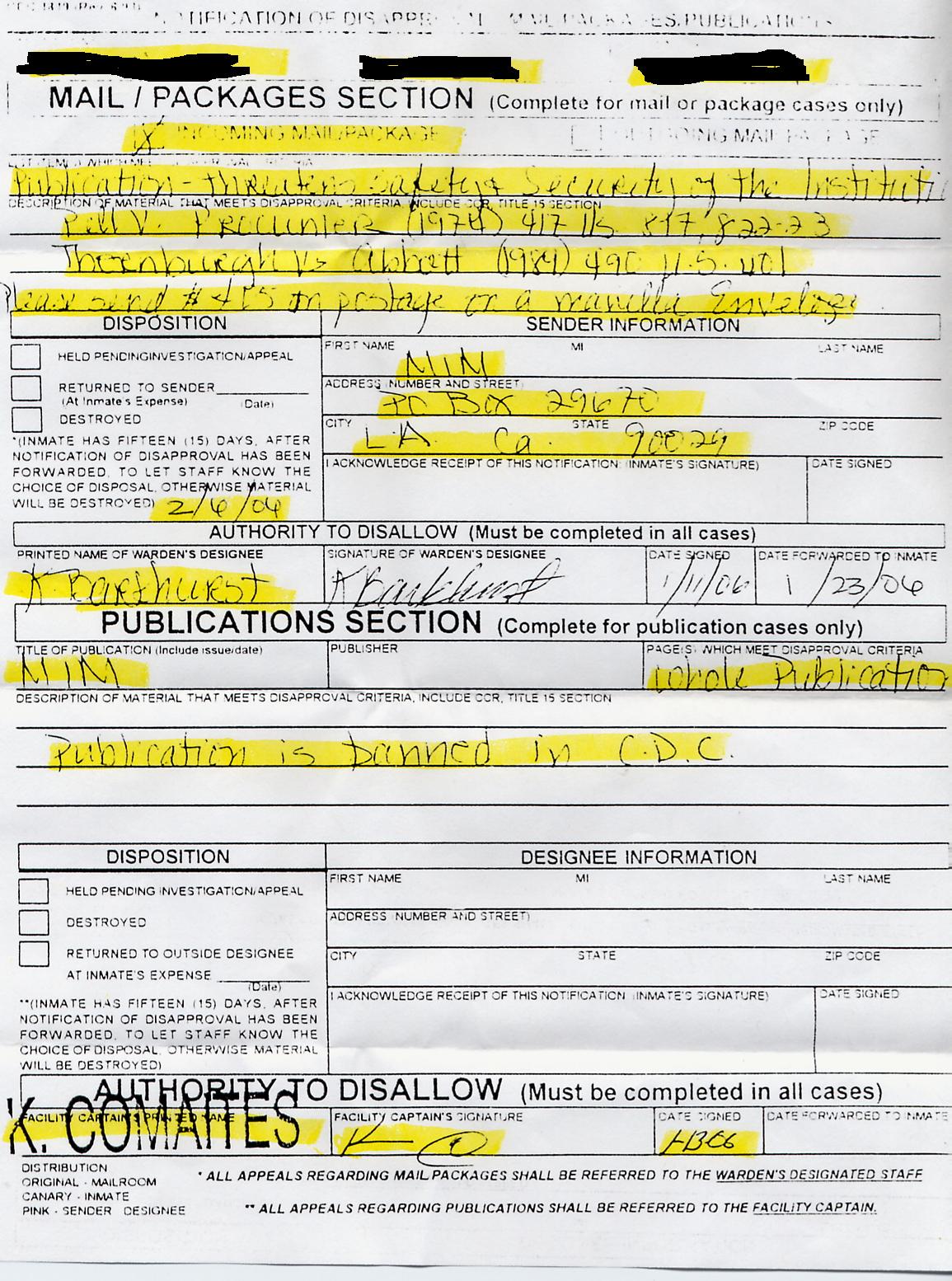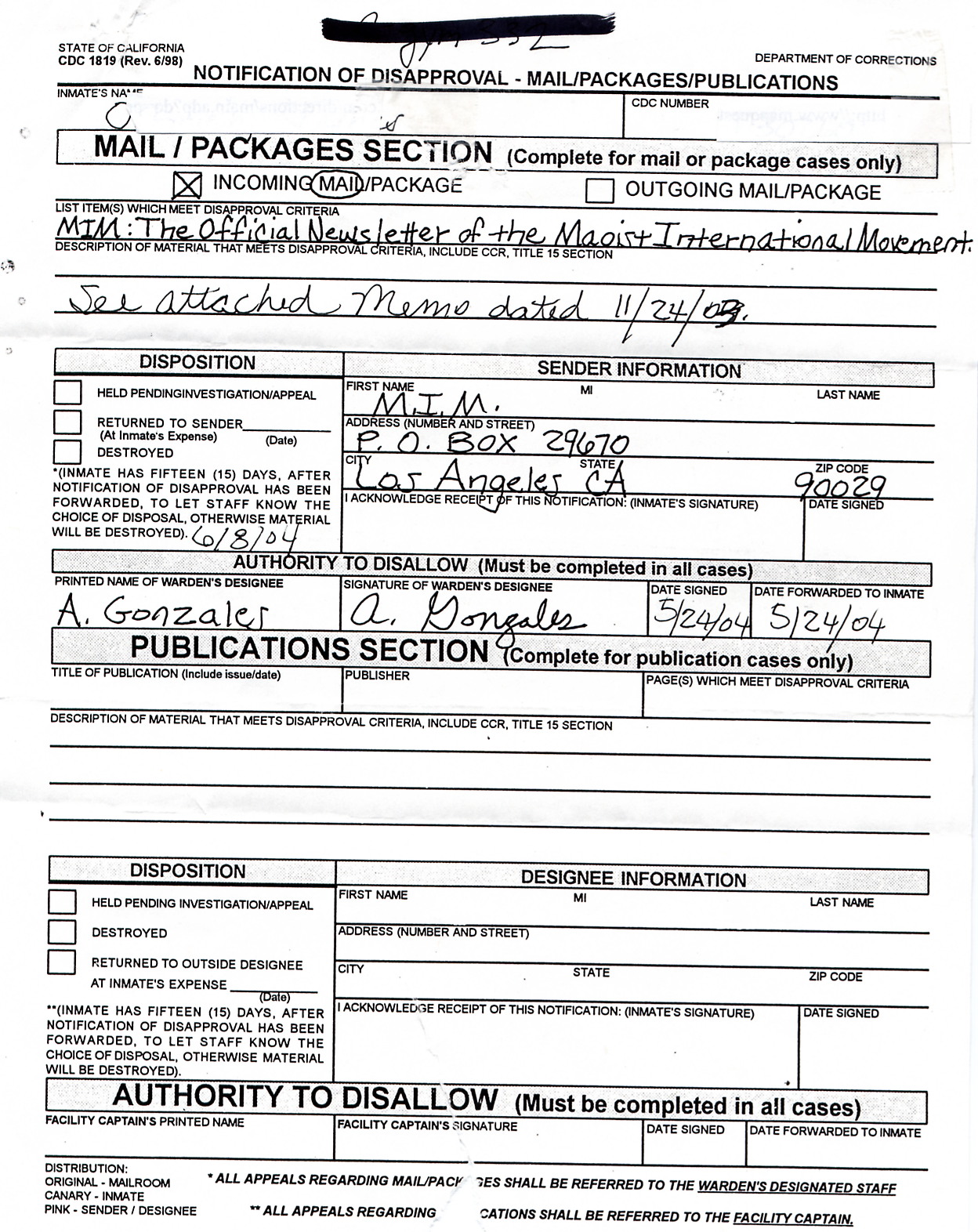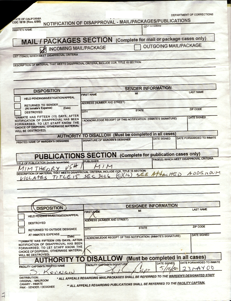 California, January, 2007 MIM lit denied "disallowed per institutional directive"