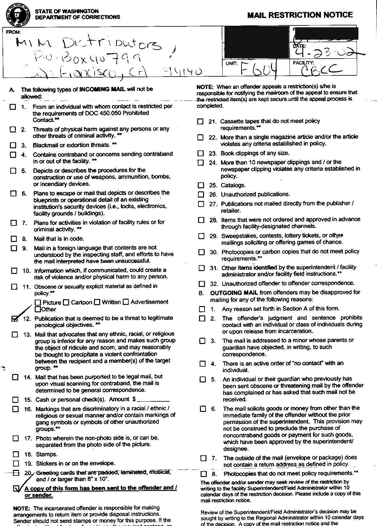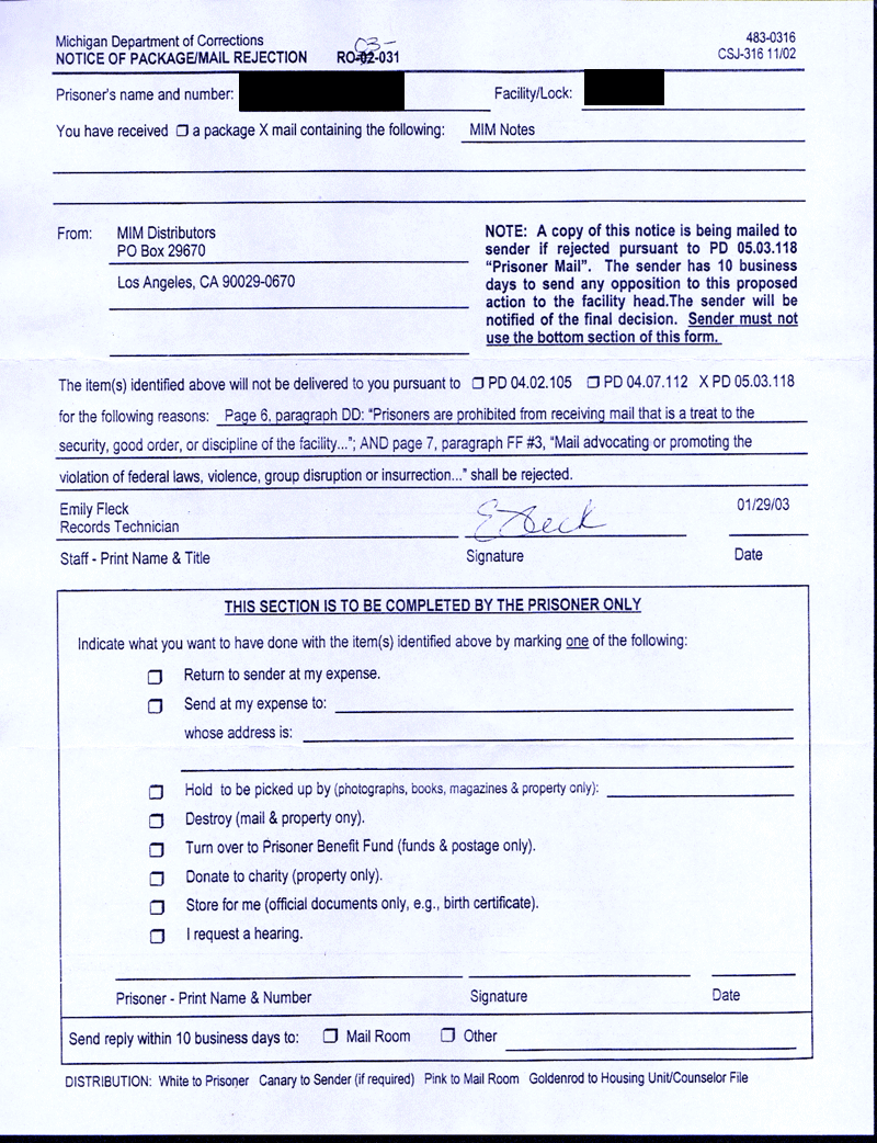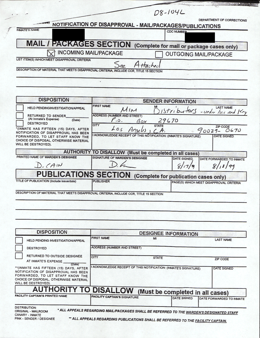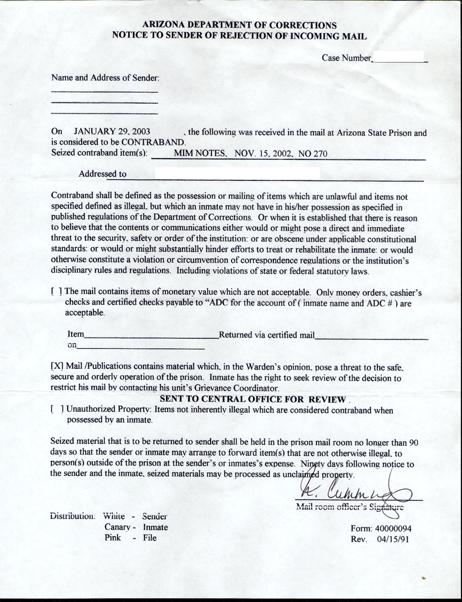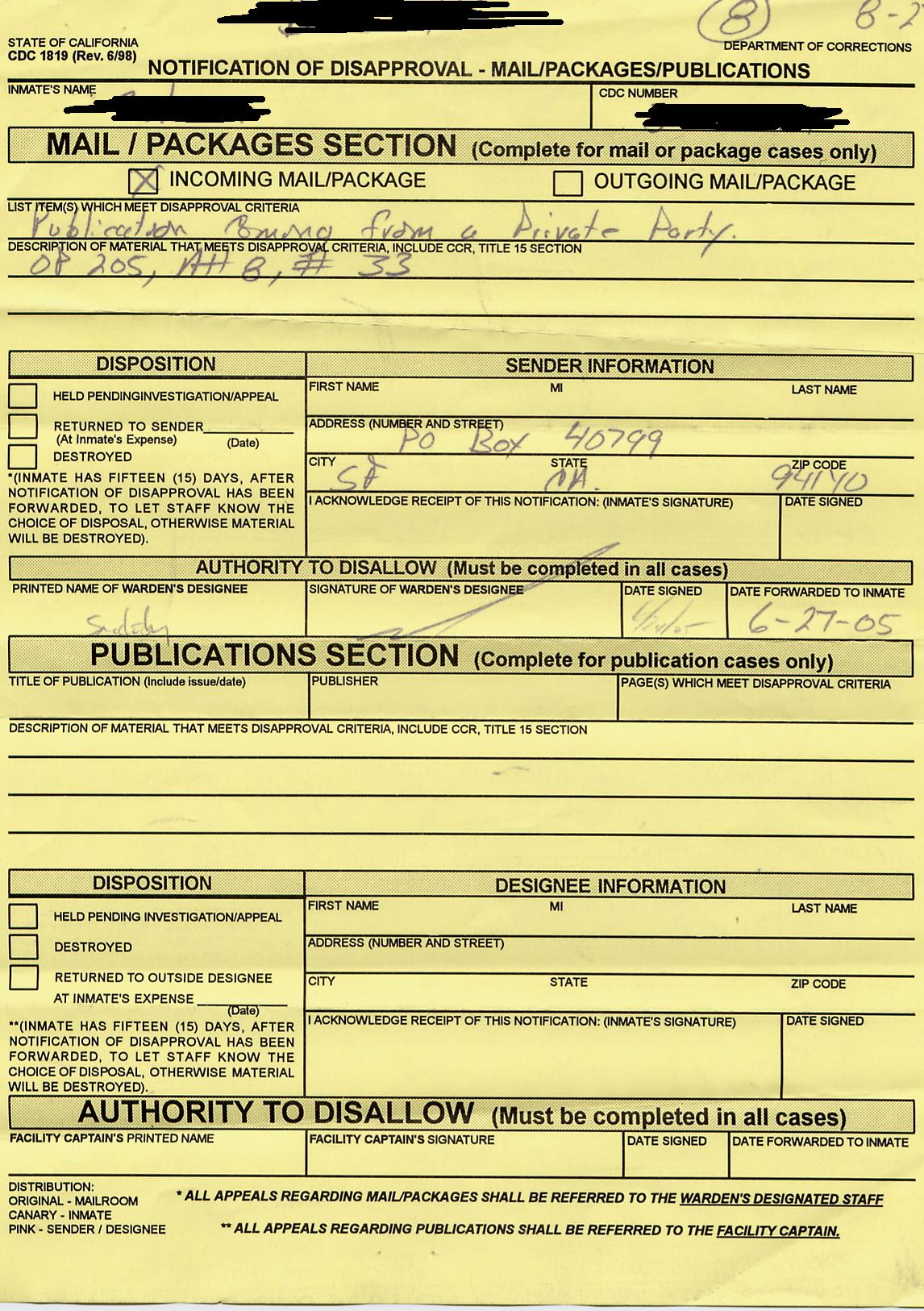 California, January, 2007 MIM lit denied "disallowed per institutional directive"