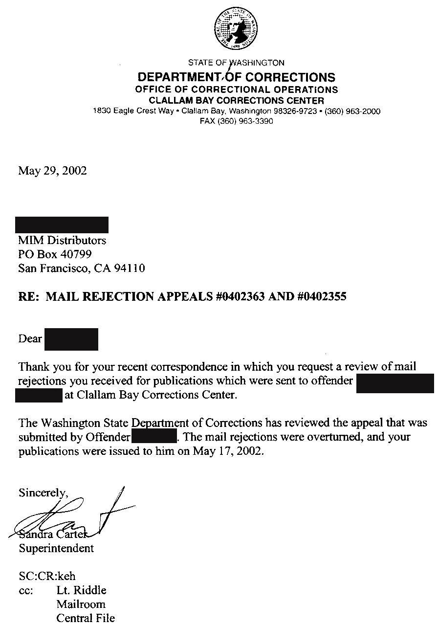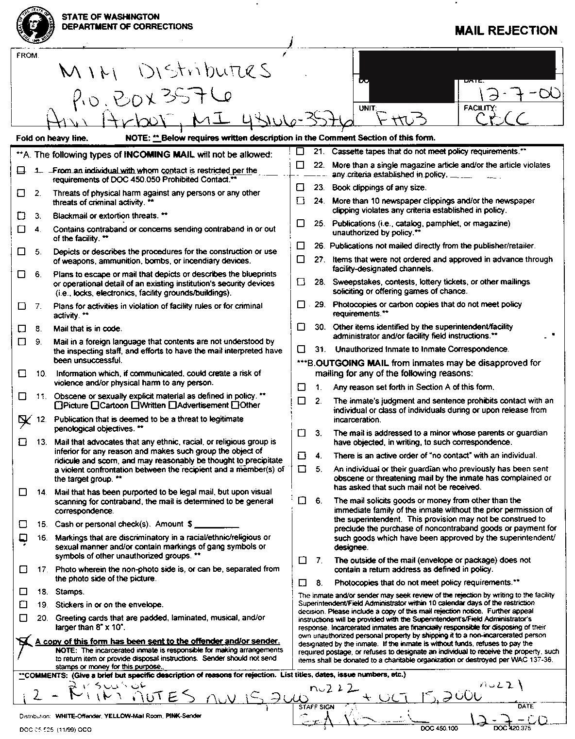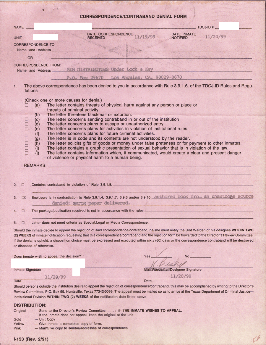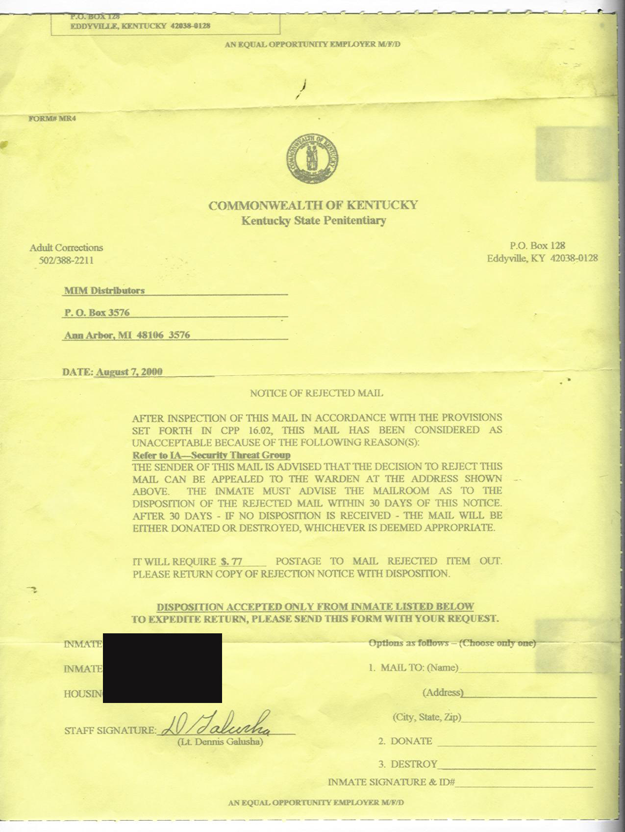California, January, 2007 MIM lit denied "disallowed per institutional directive"