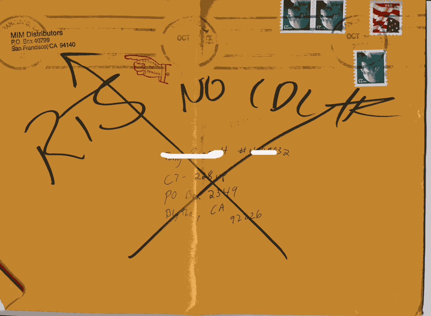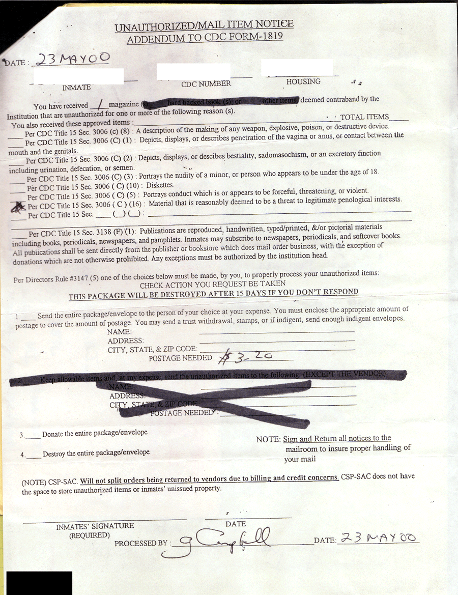 California, January 2007 Sample letters rejected by HDSP (unopened) under ban
