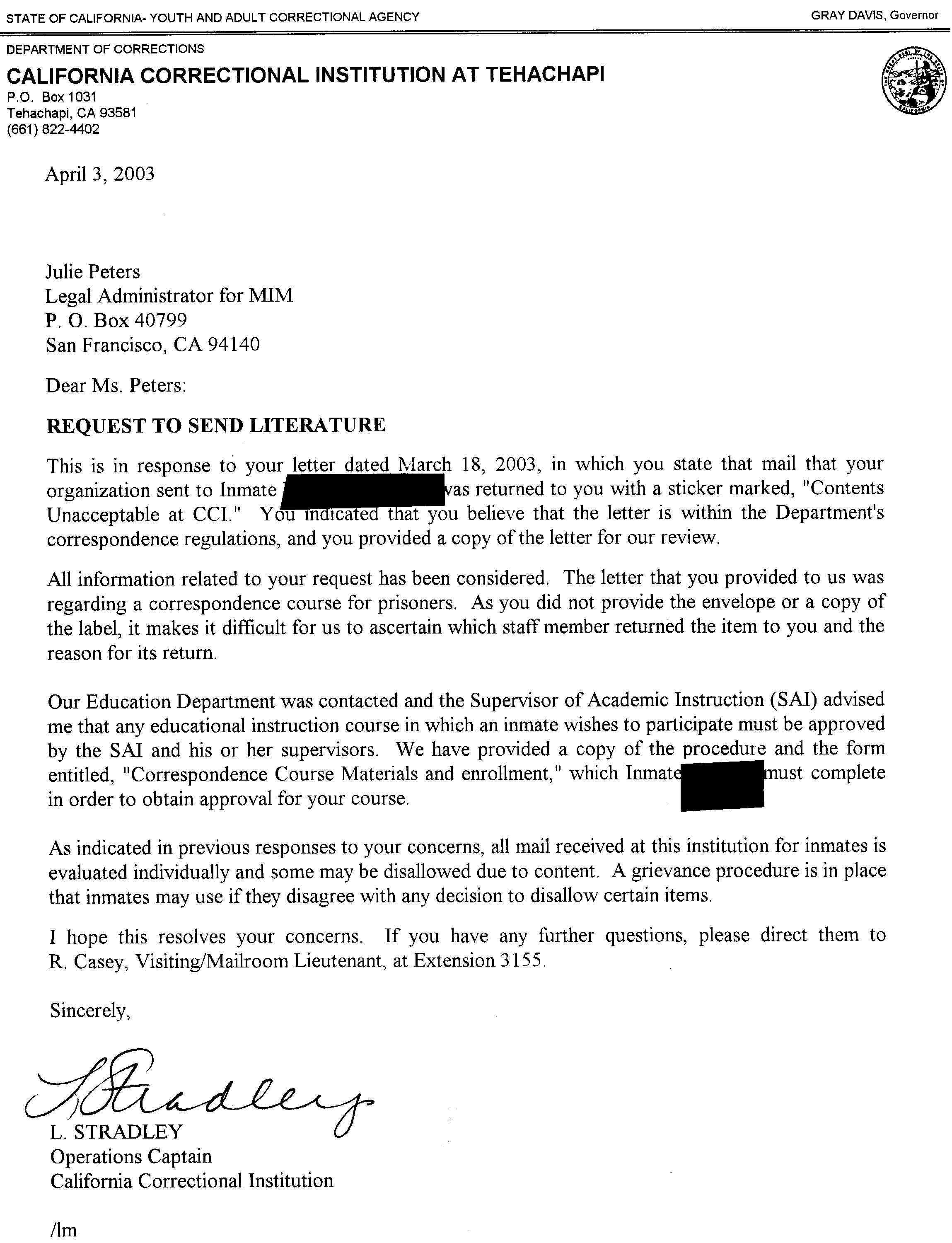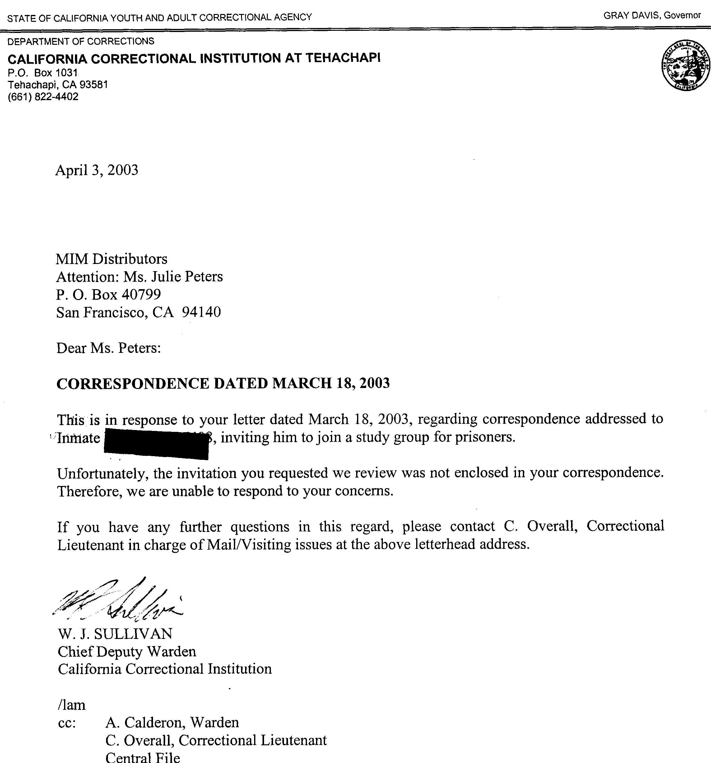 California, February 2, 2006 Letter rejected by Tehachapi as "unacceptable"