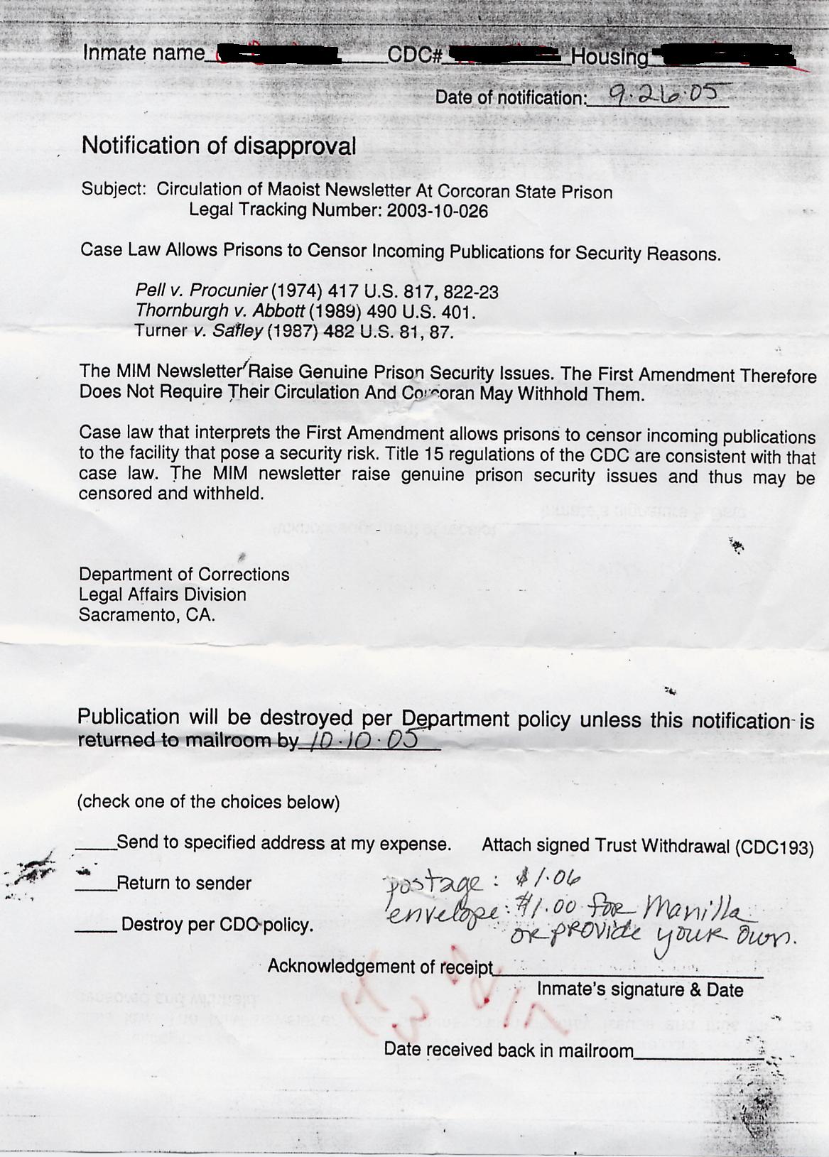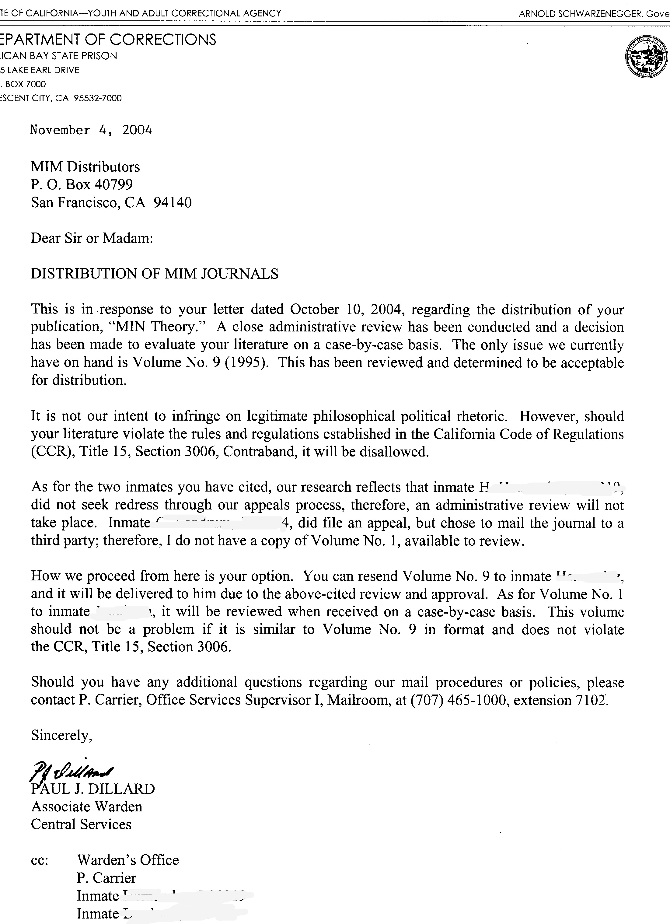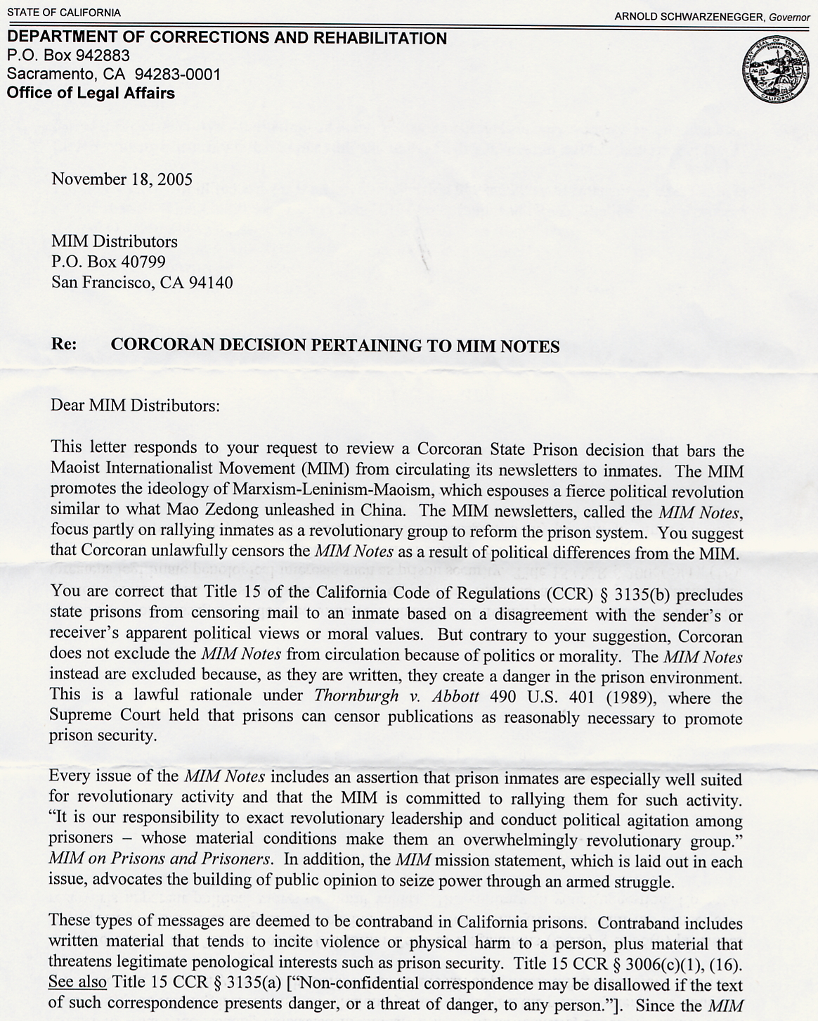 DECEMBER 2006: MIM literature banned in all California prisons per order of Scott Kernan, Director of Adult Institutions. All letters and books (including dictionaries!) being censored.