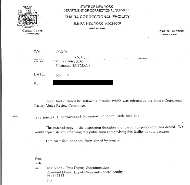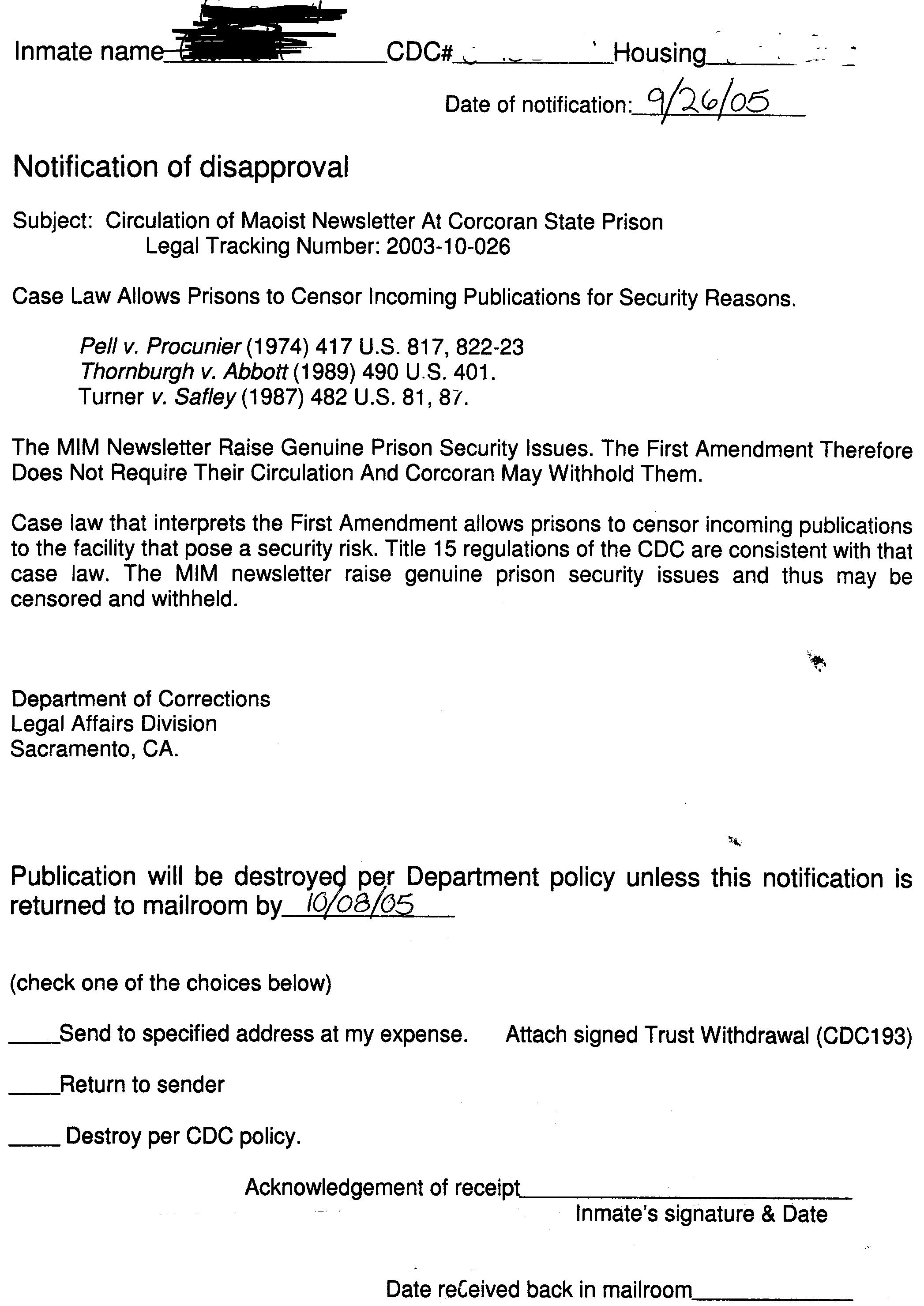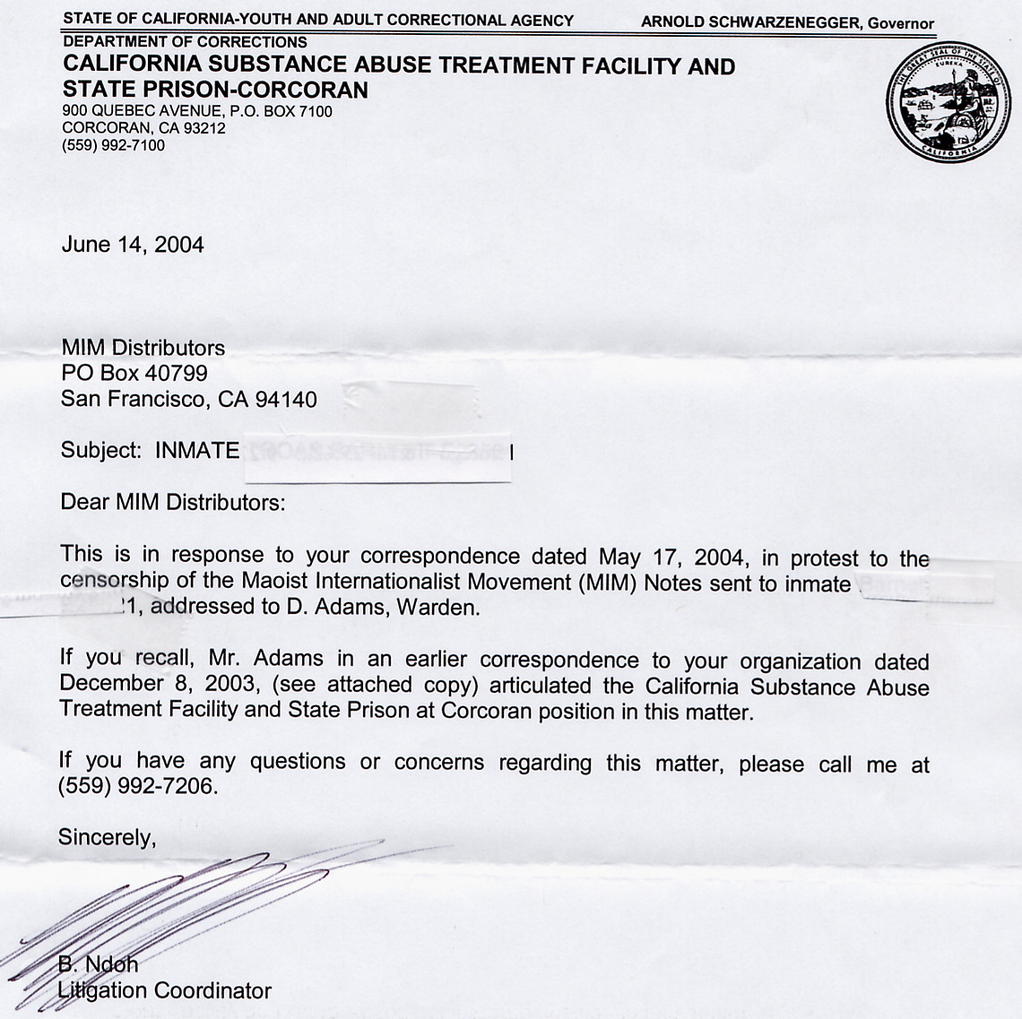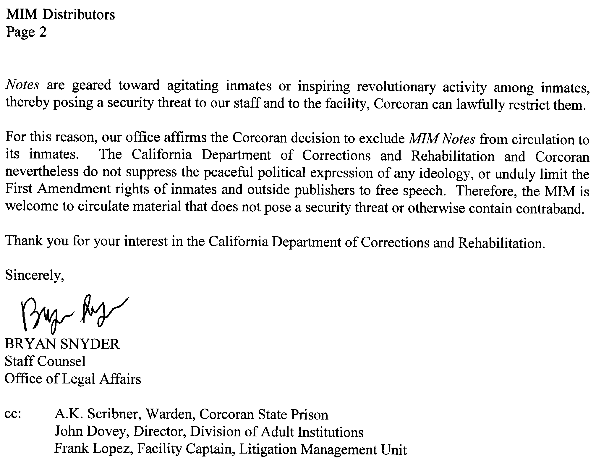 DECEMBER 2006: MIM literature banned in all California prisons per order of Scott Kernan, Director of Adult Institutions. All letters and books (including dictionaries!) being censored.