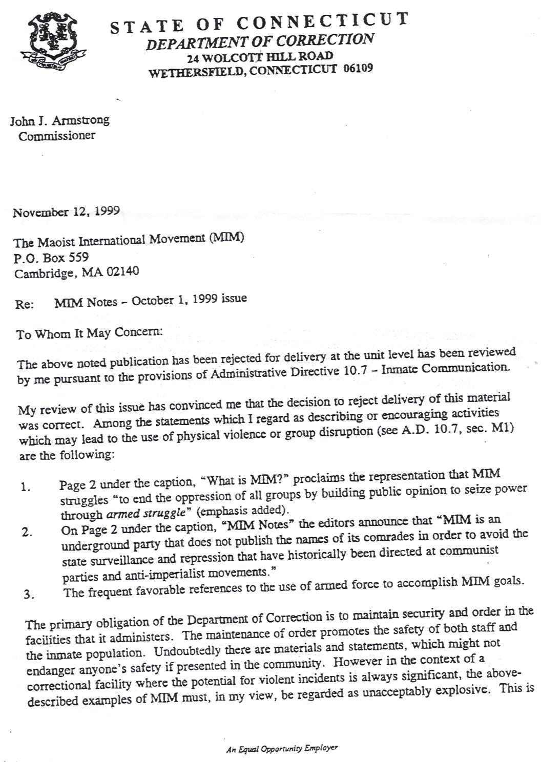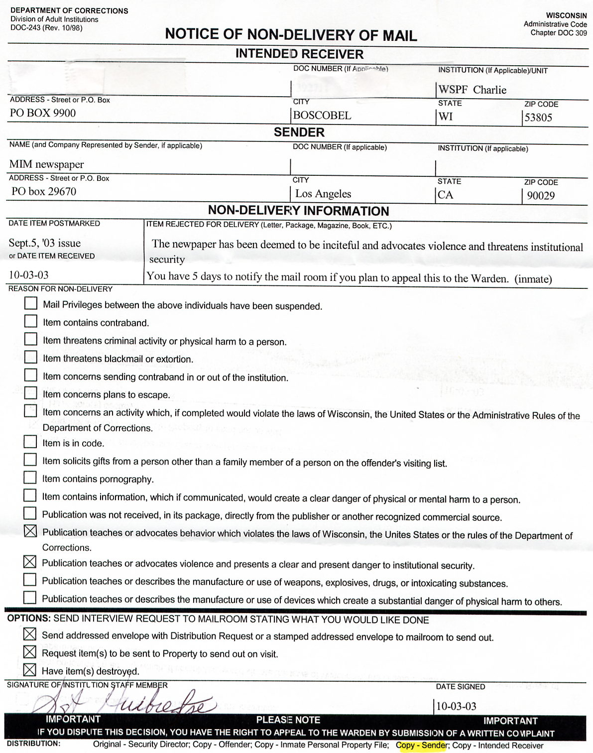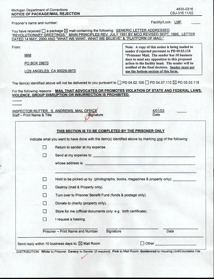 California, March 28, 2003 CCI warden says MIM Theory promotes armed overthrow of the U.$. and so is dangerous to his institution