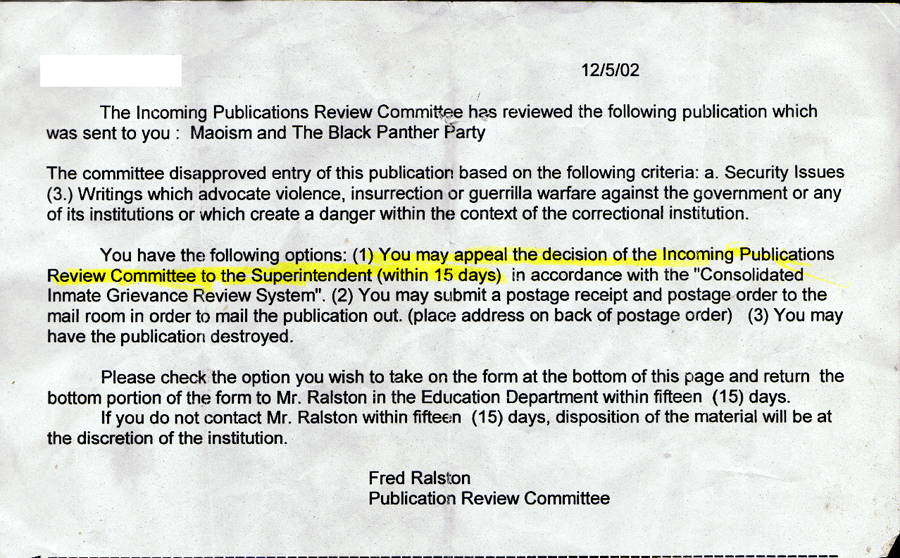 Pennsylvania, December 5, 2002 Prison rejects "Maoism and the Black Panthers" history booklet