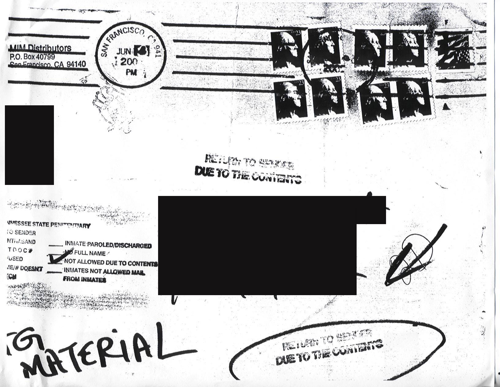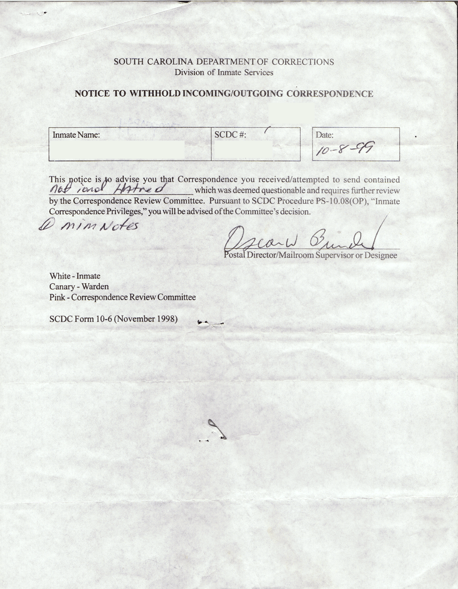 Tennessee, October 5, 2002 Warden informs prisoner that MIM Notes will be reviewed case-by-case for censorship