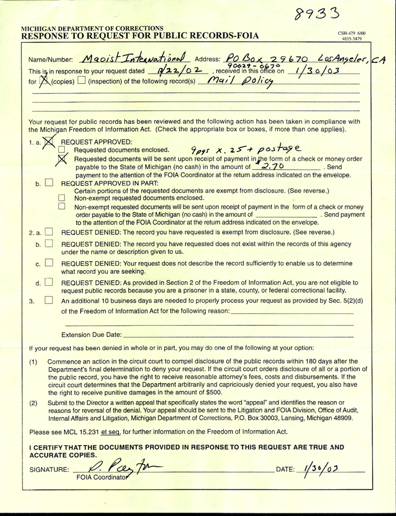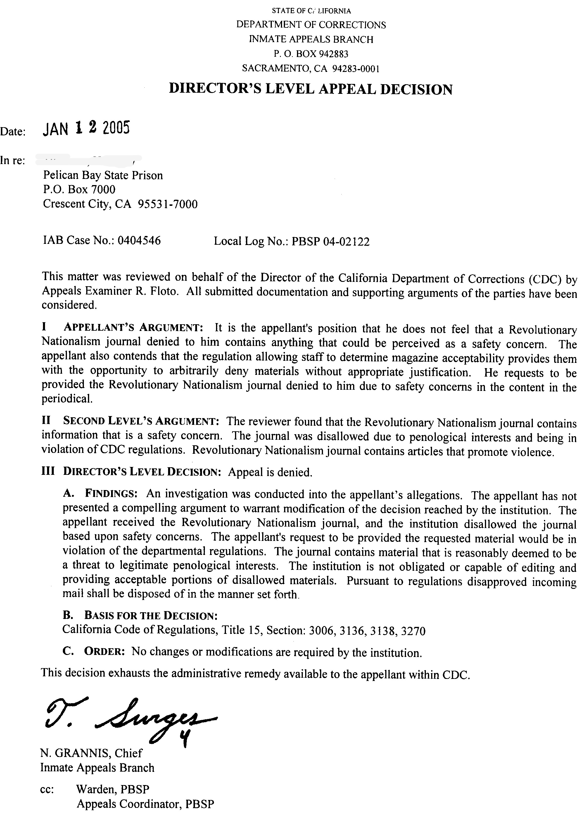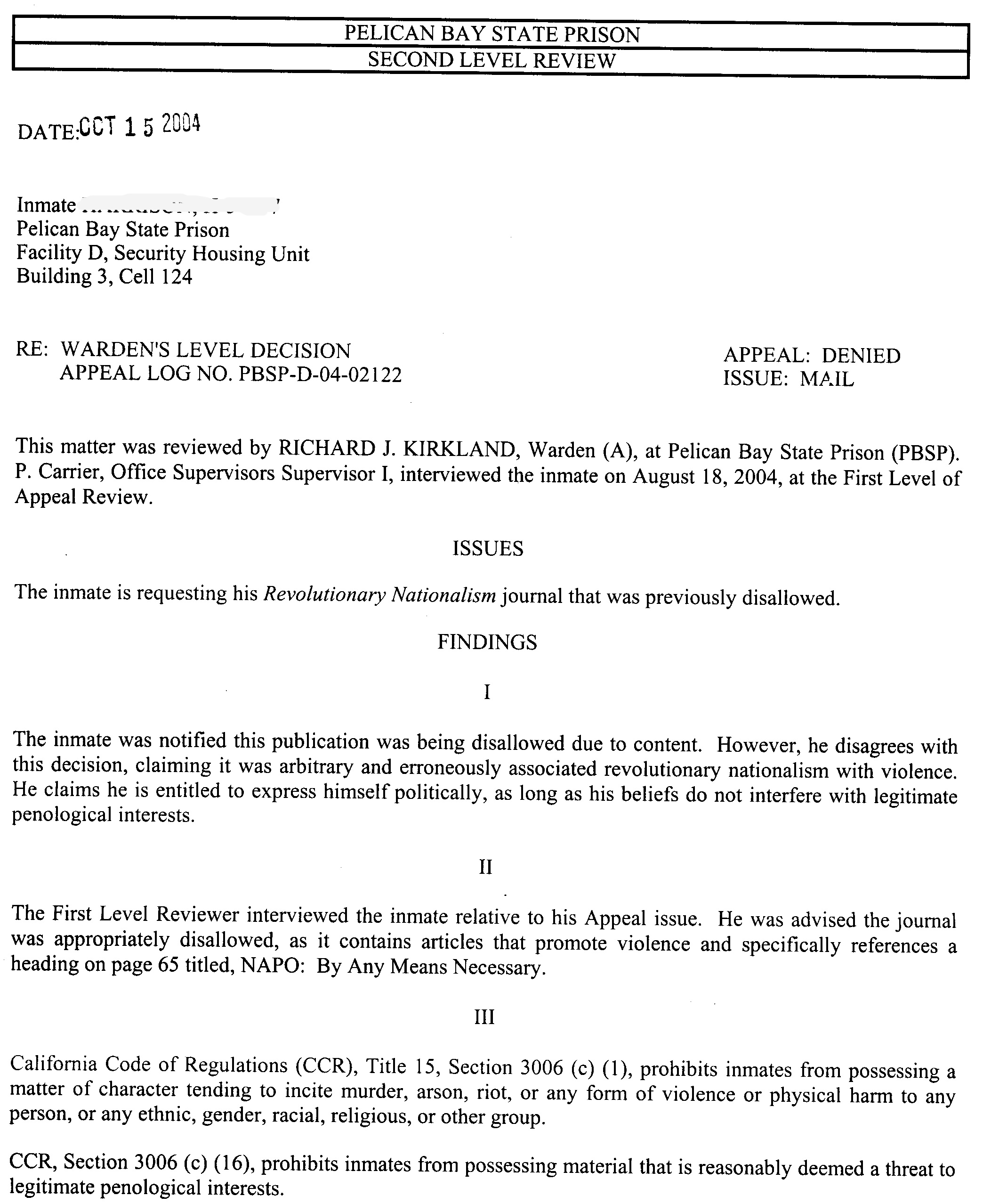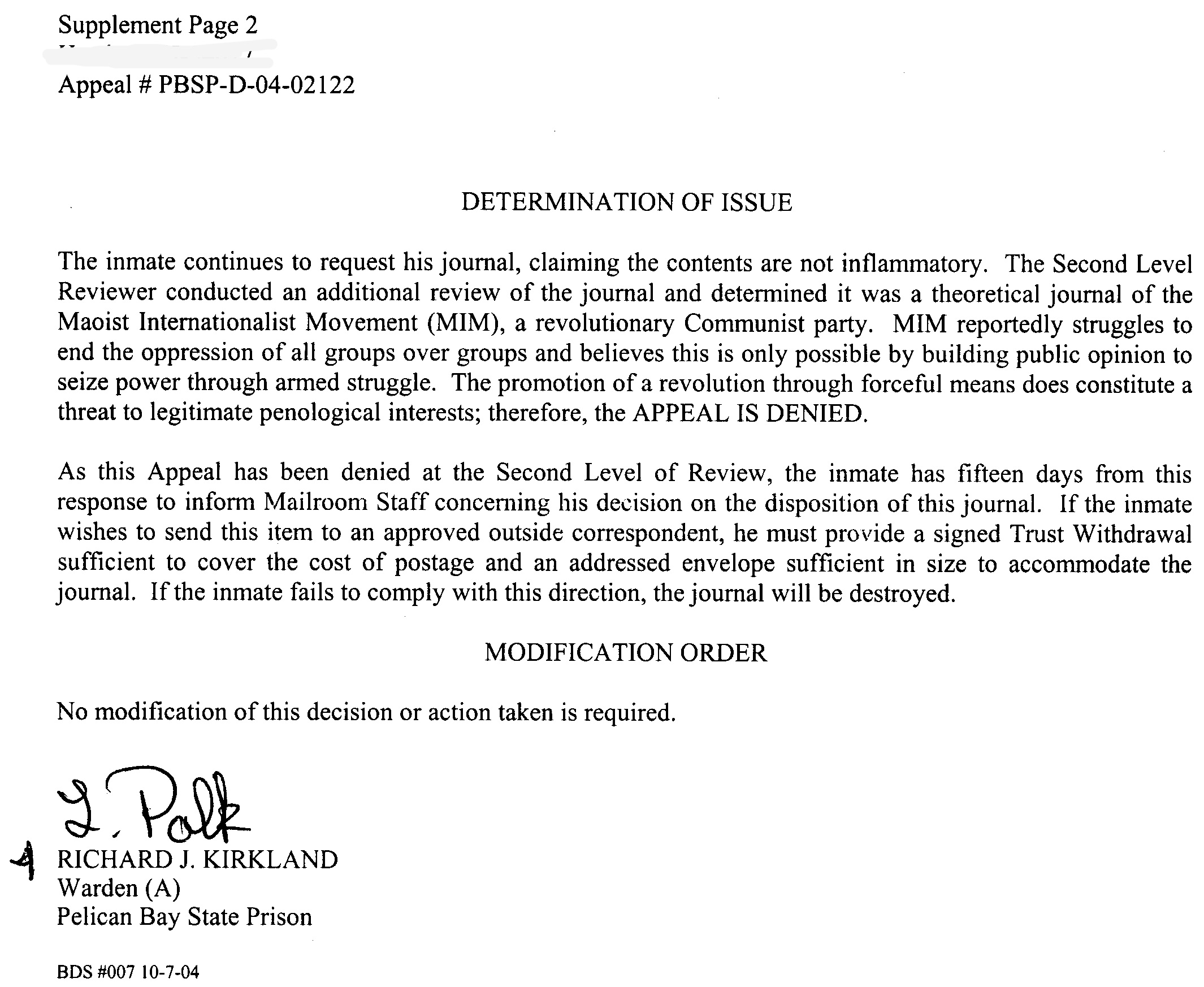 California, January 12, 2005 Director's level review rejected - MIM Theory on revolutionary nationalism rejected to Pelican Bay