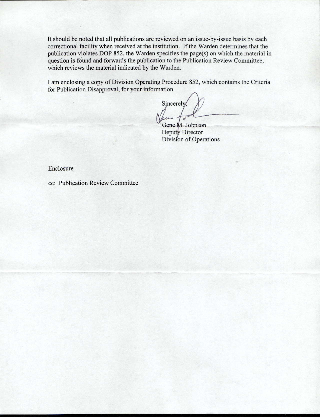California, October 25, 2006 Pelican Bay warden affirms ban of MIM from prison (page 2)