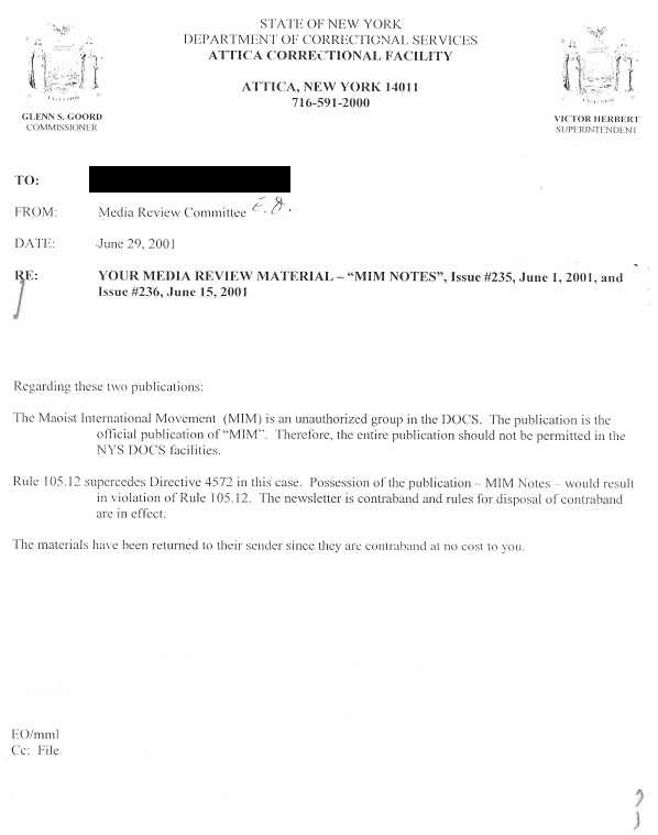 Attica, NY, June 29, 2001 Attica rules that MIM publications are "contraband"