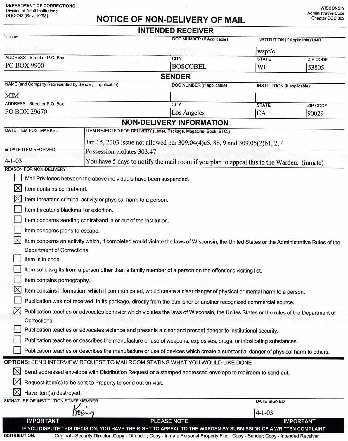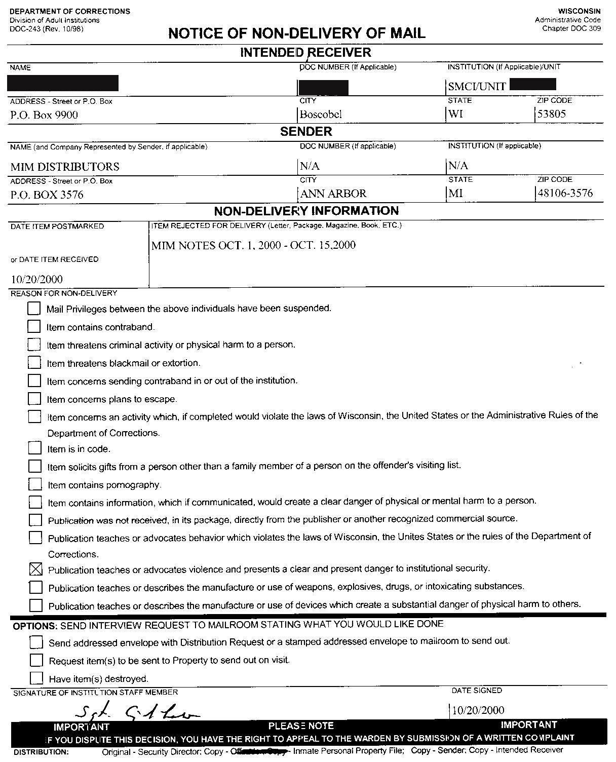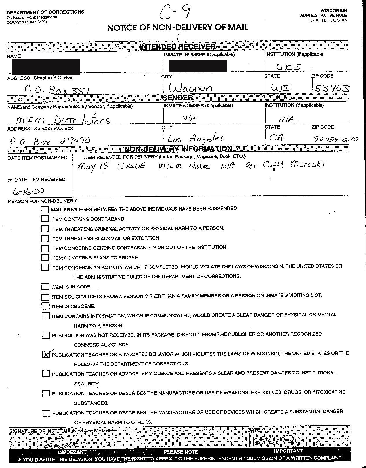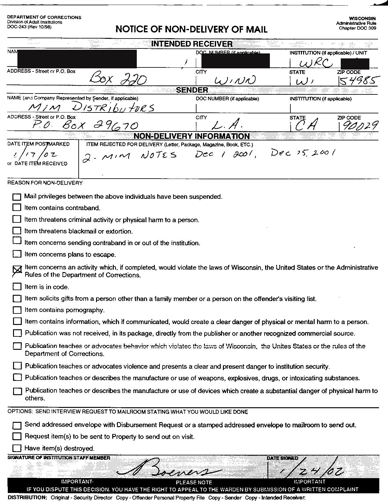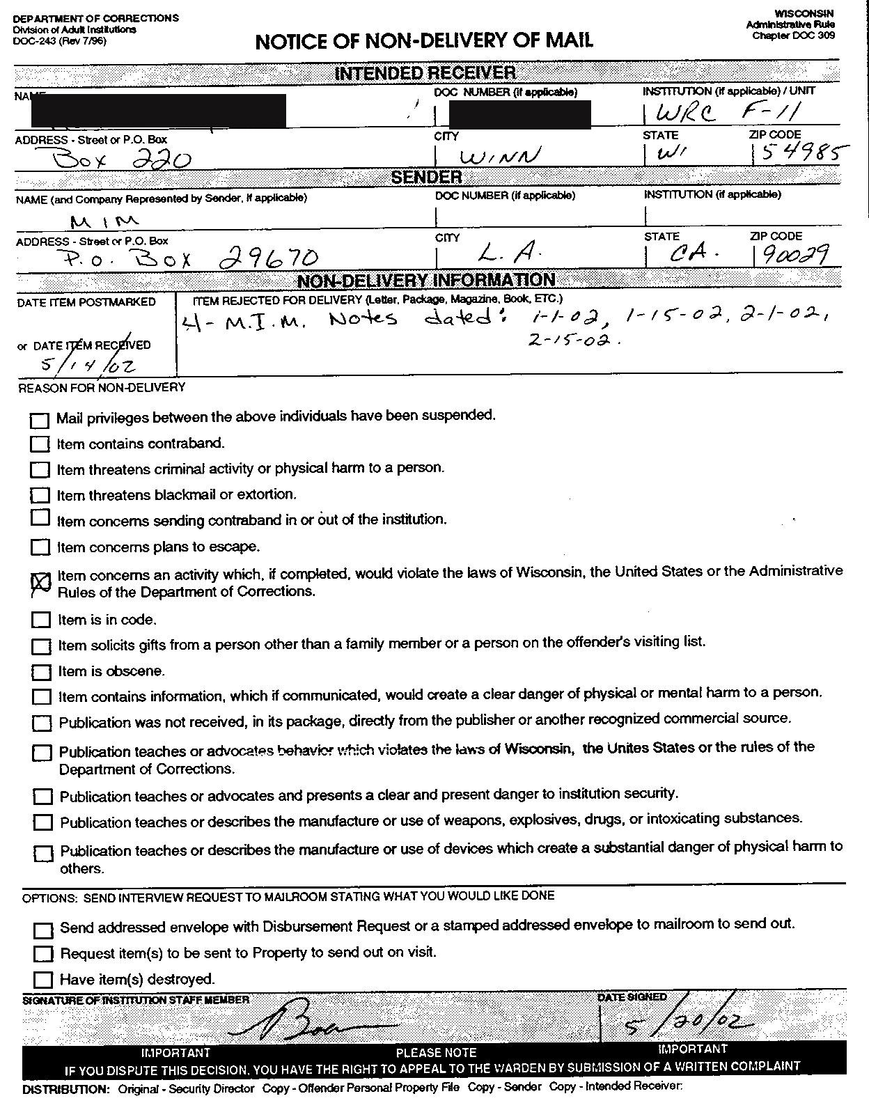 Wisconsin, December, 2002 December 1 2002 MIM Notes rejected for: containing contraband, threatening criminal activity or harm, describing activity that violates laws, and creating danger of harm.