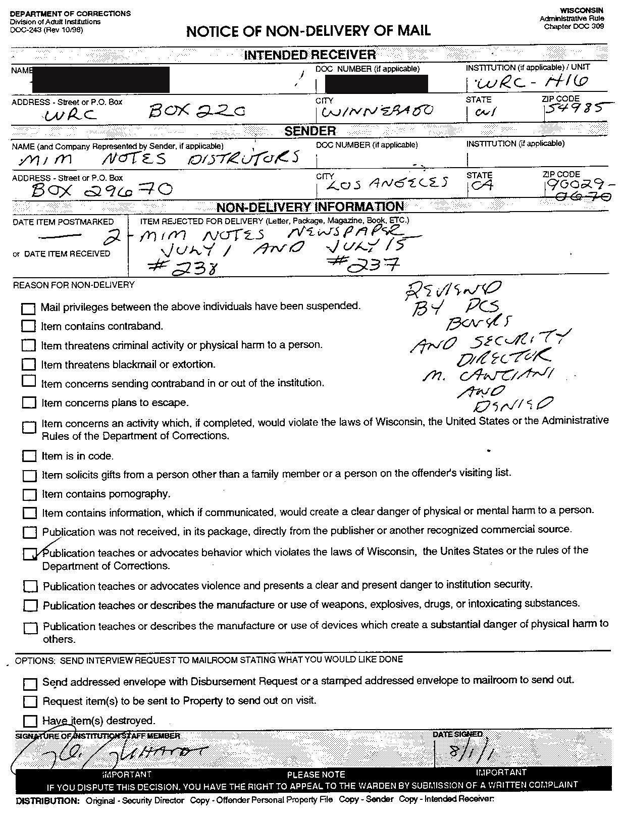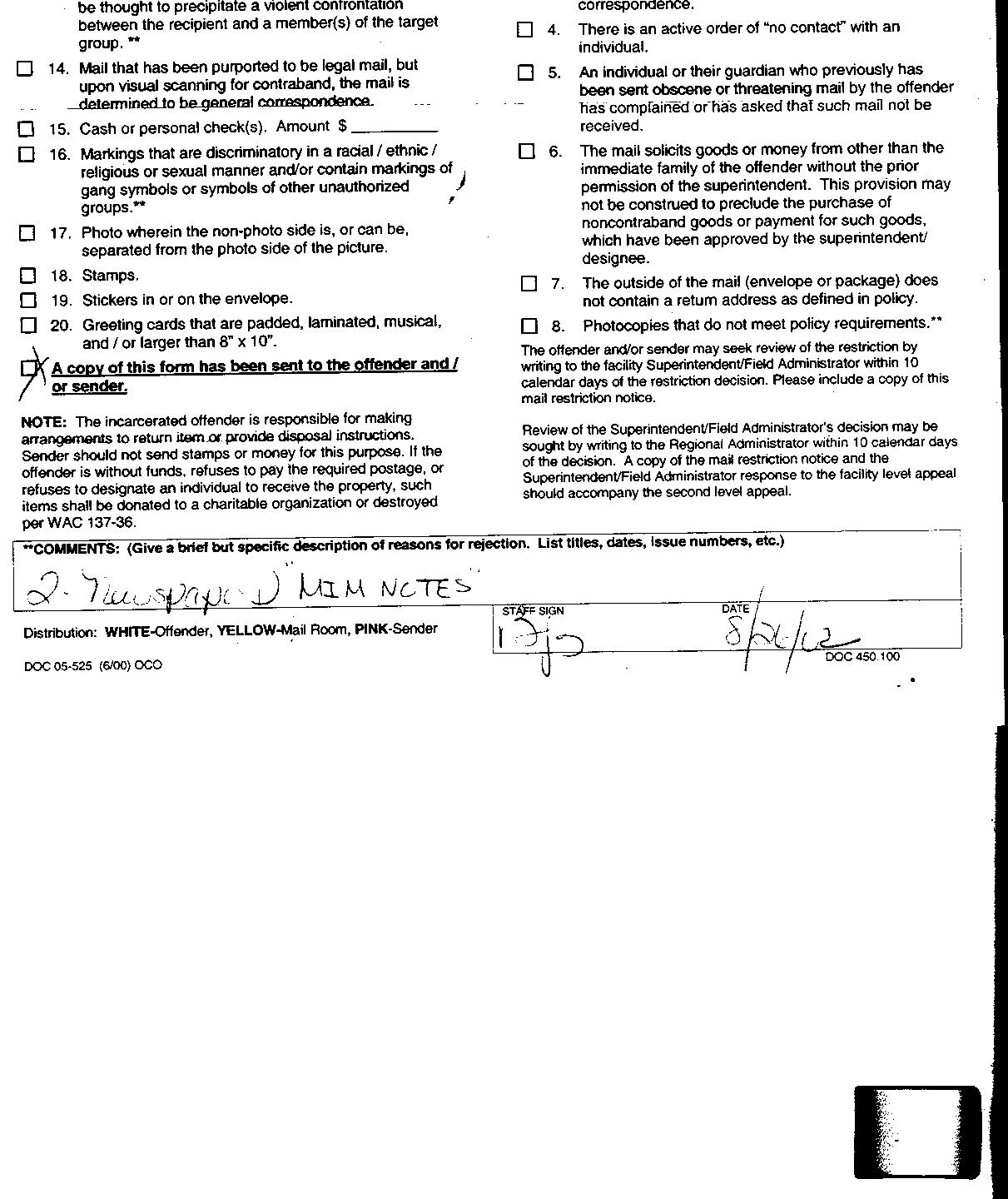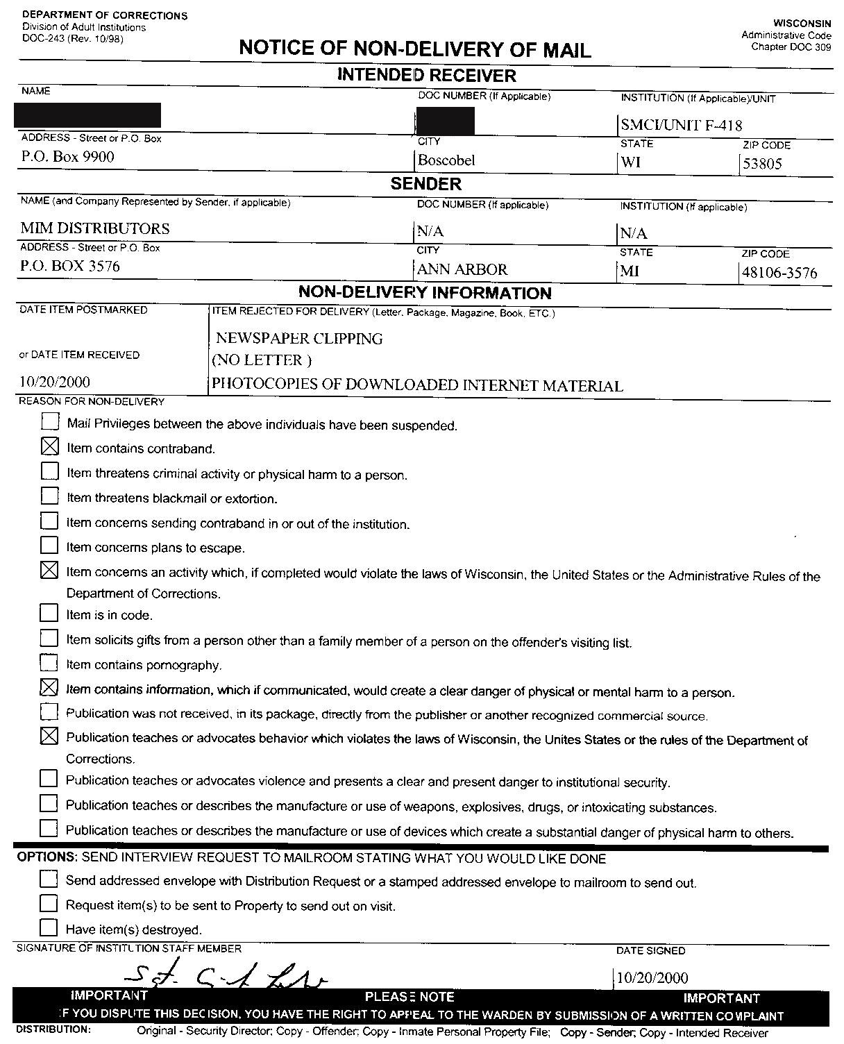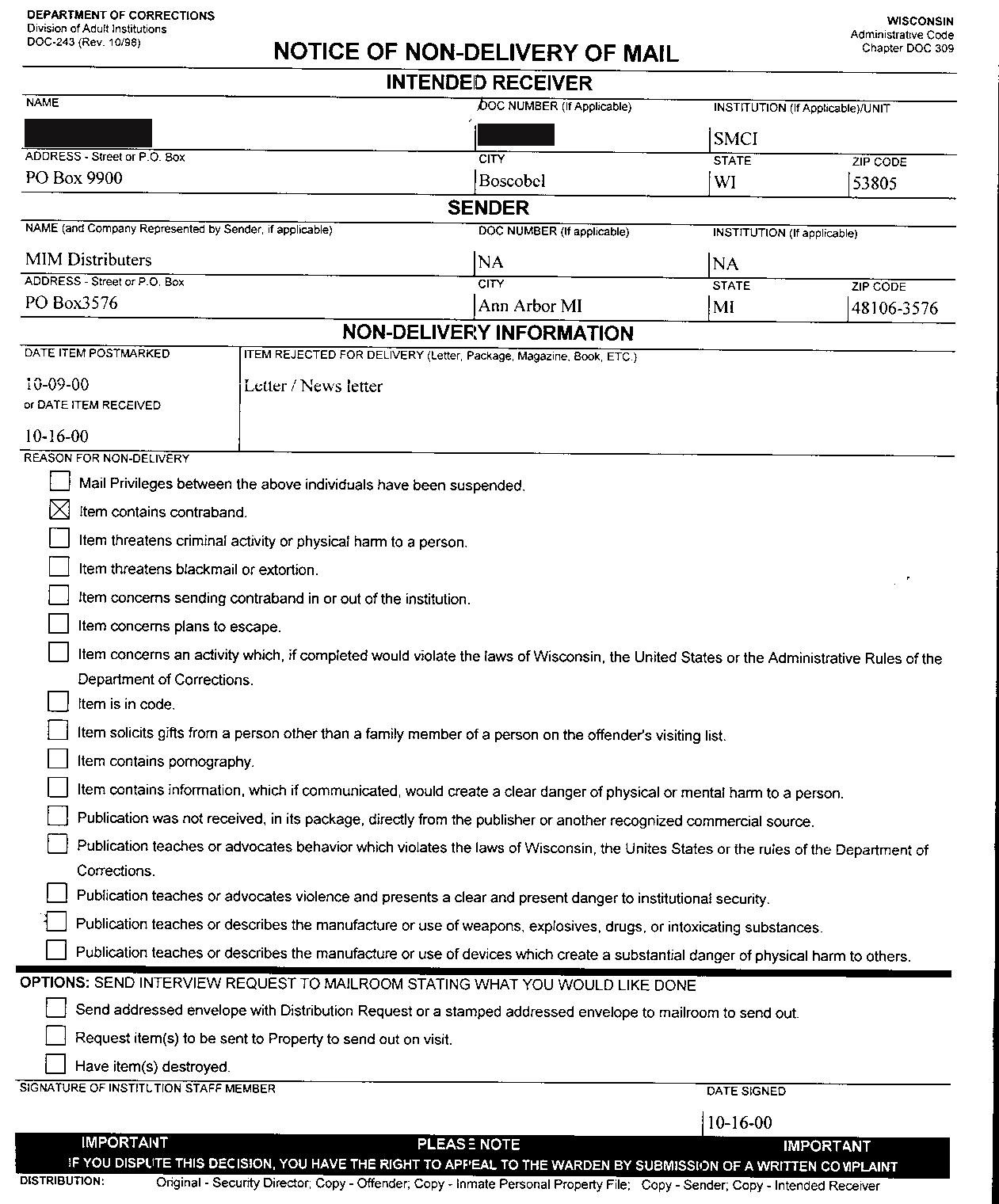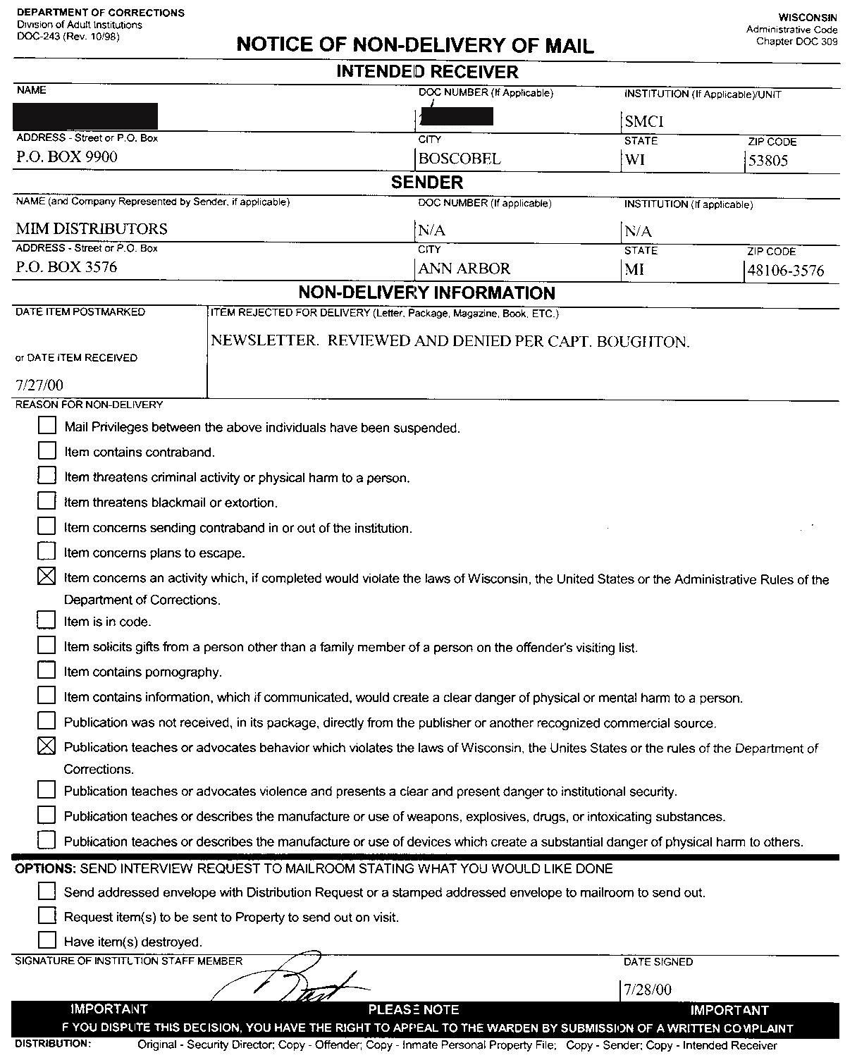 Wisconsin, December, 2002 December 1 2002 MIM Notes rejected for: containing contraband, threatening criminal activity or harm, describing activity that violates laws, and creating danger of harm.