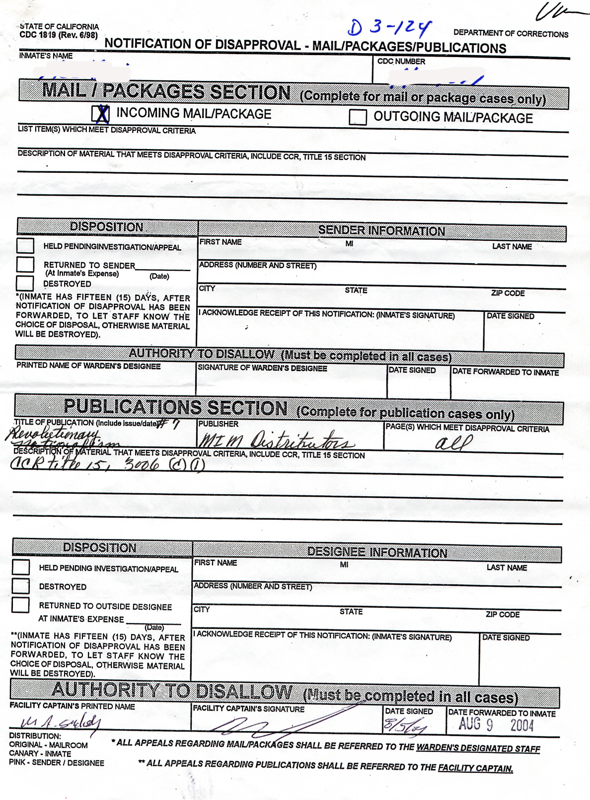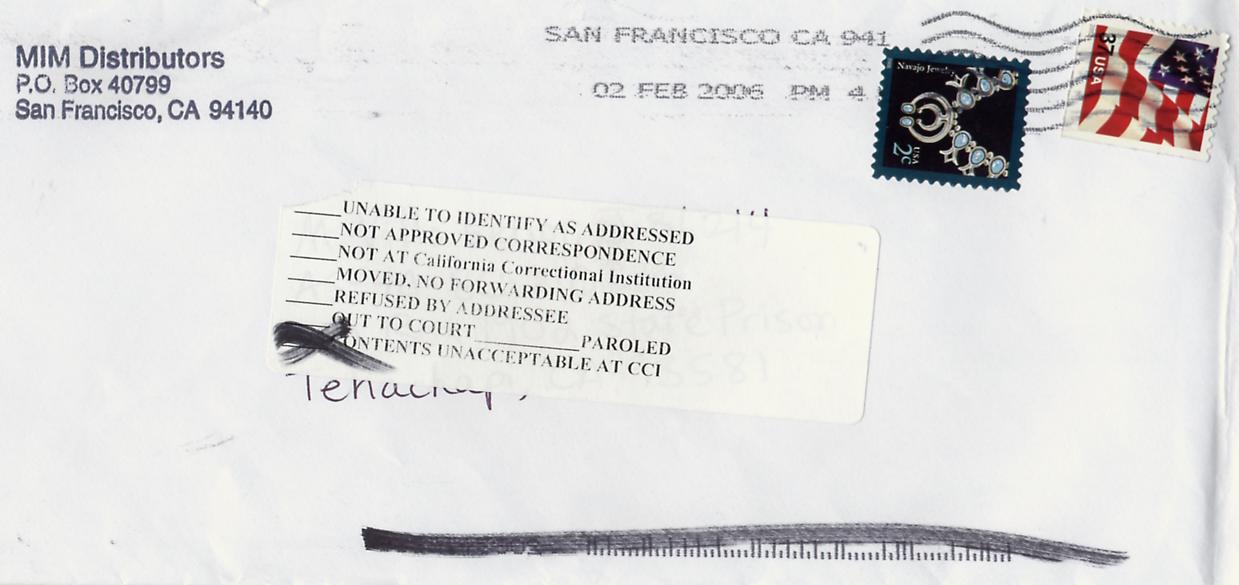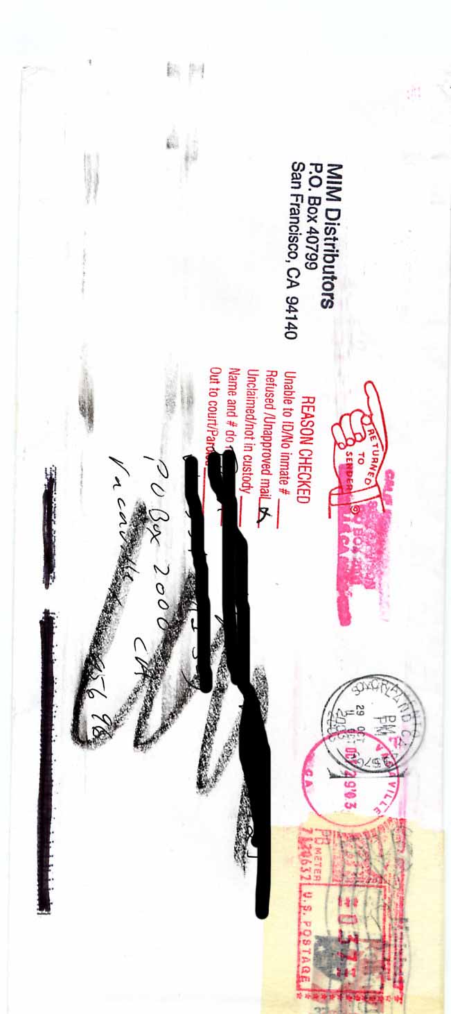 California, August 2004 MIM Notes May 15 rejected for "inmate to inmate correspondance"