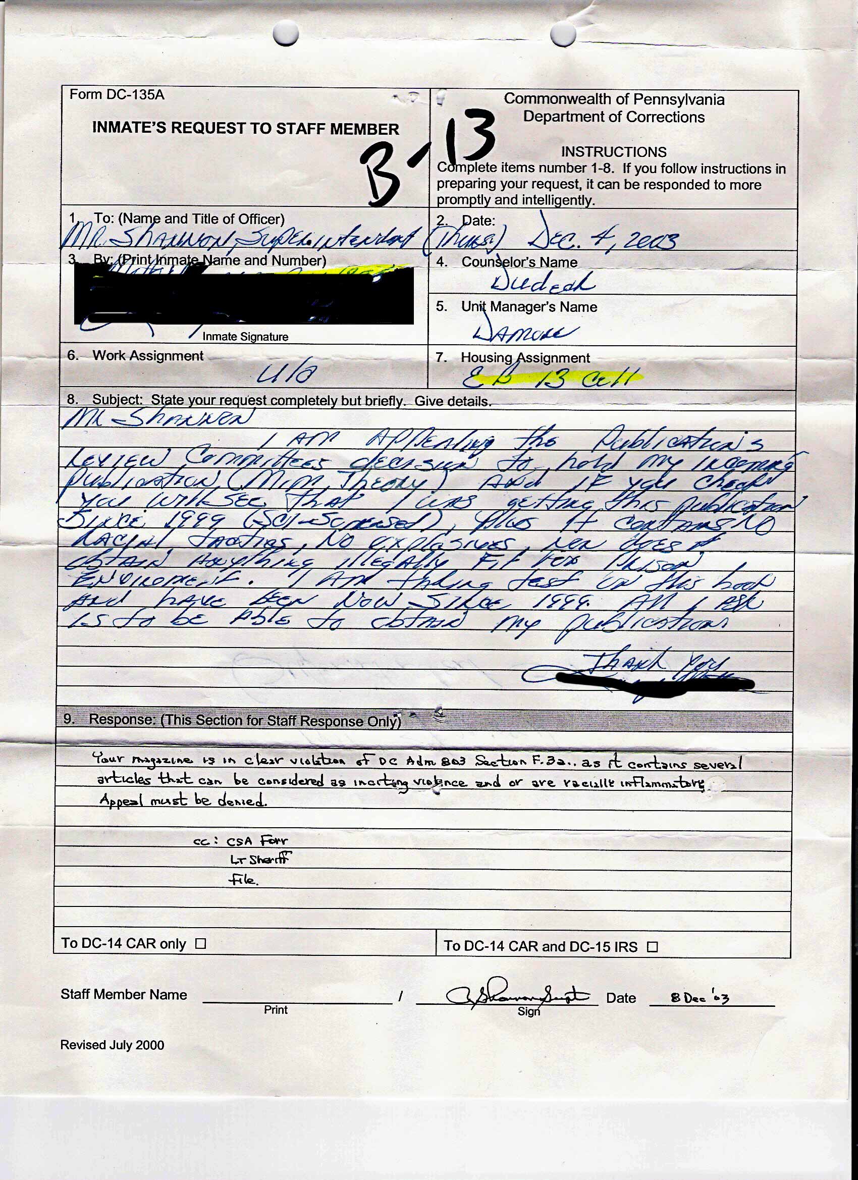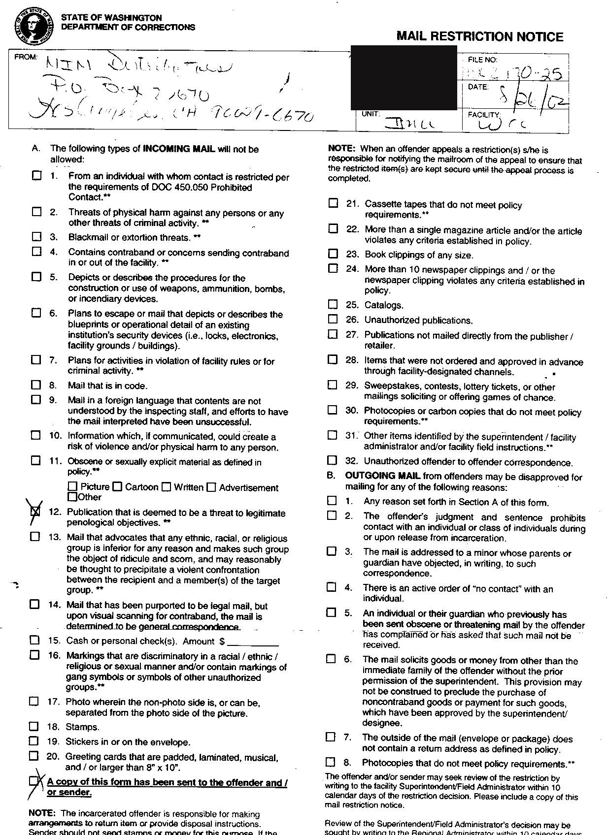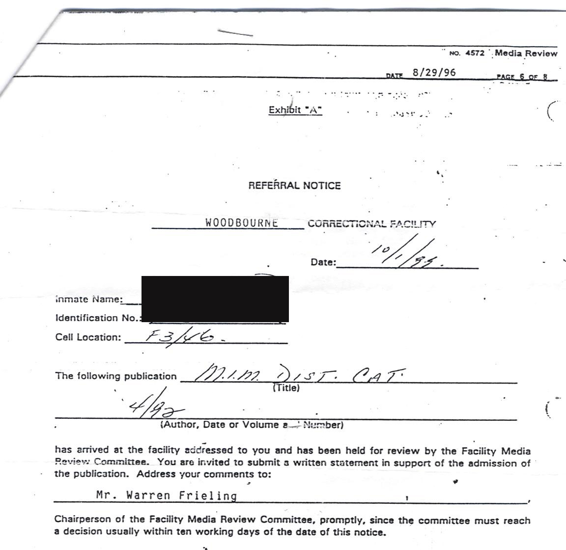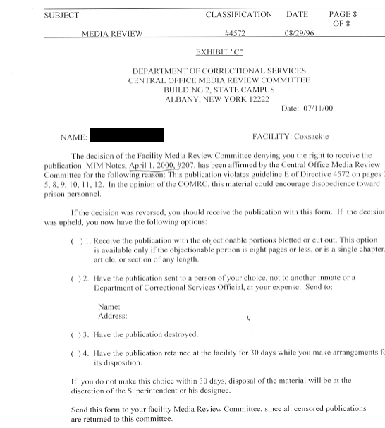 Elmira, NY, March 6, 2001 Prison administration paperwork for inmate appeal of censorship*