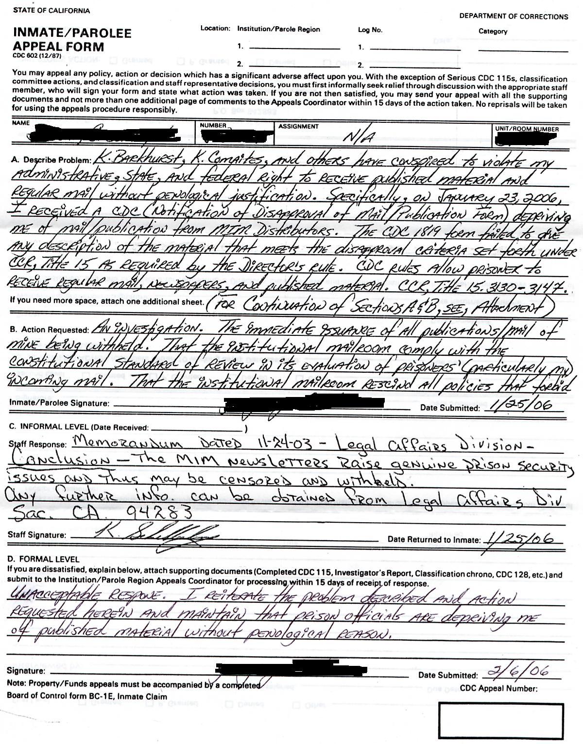 California, July 20, 2006 Corcoran denies appeal for MIM lit because MIM reports on unjust prison conditions (page 2)