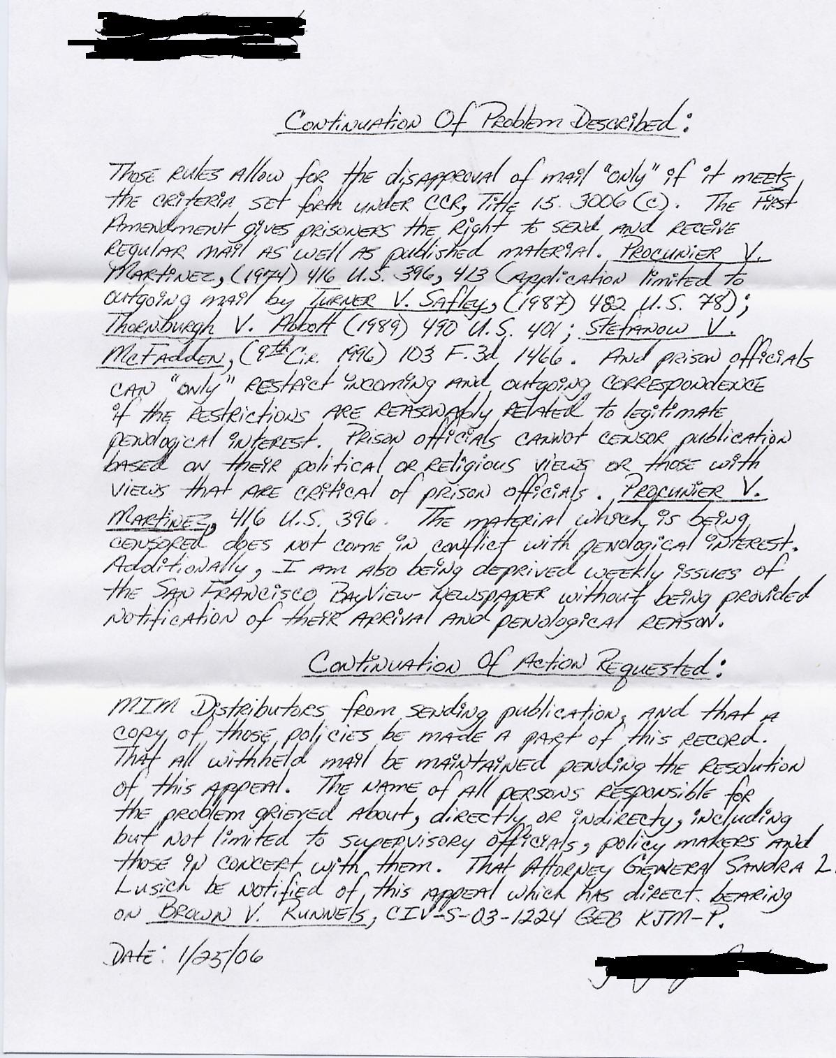 California, February 6, 2006 Prisoner appeals CSATF censorship (pg 2)