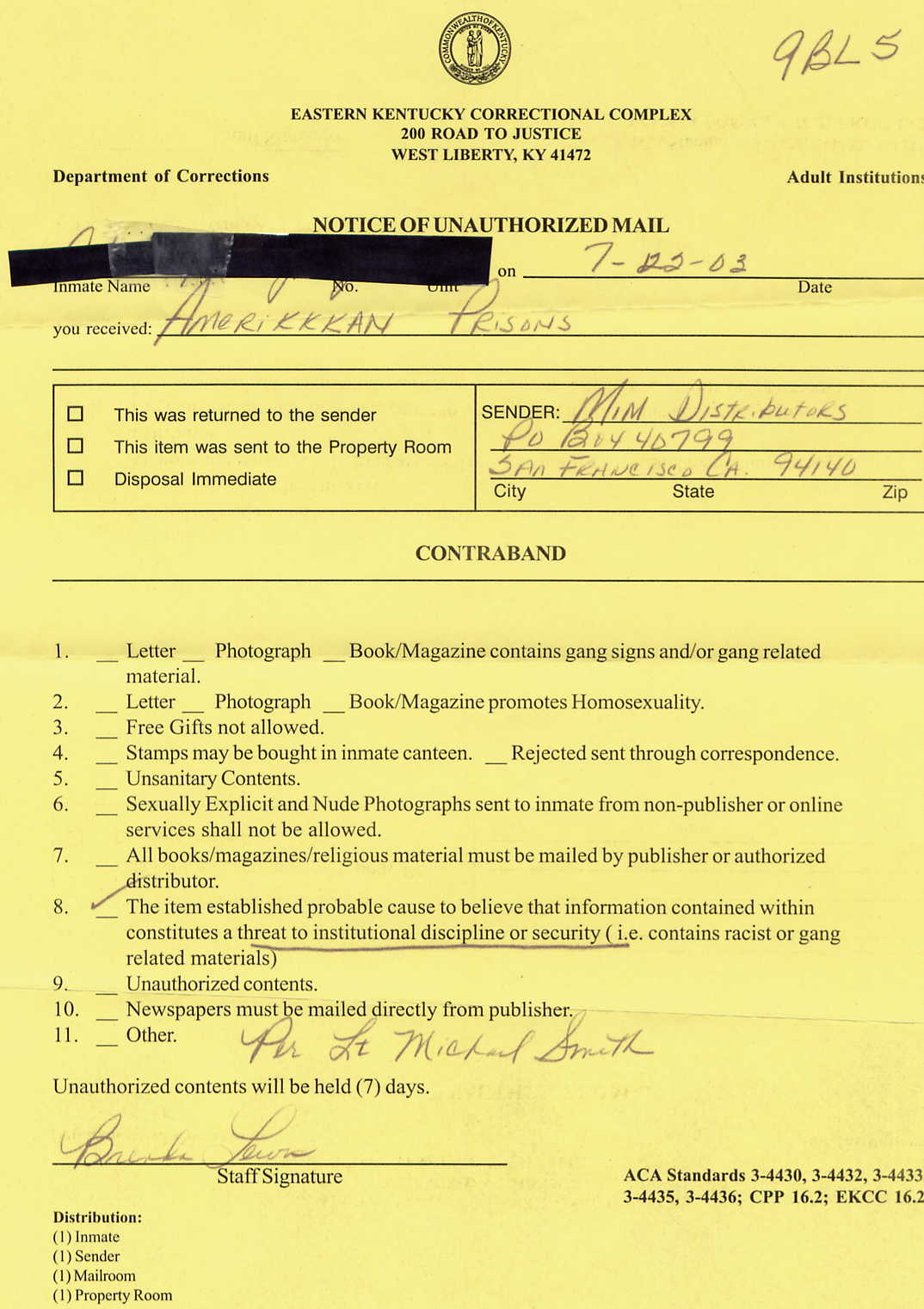 California, February 2007 Calipatria rejects Prisoners of Liberation book