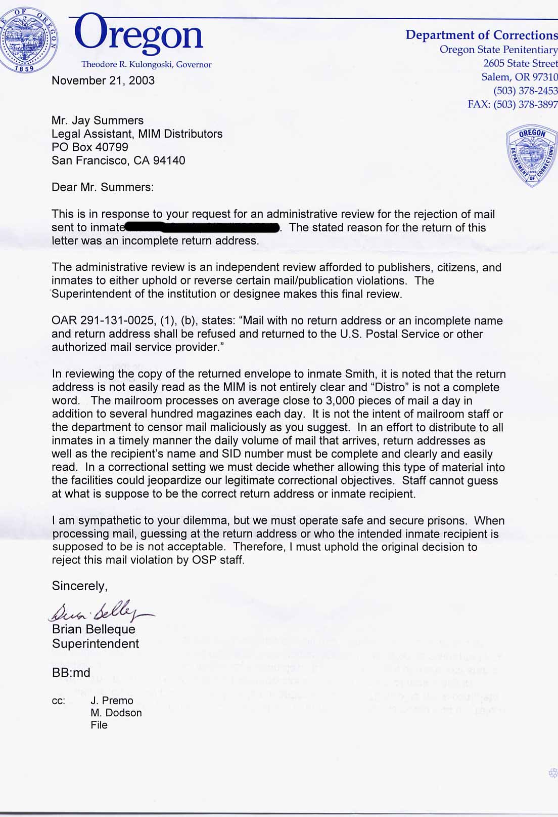 Oregon, November 2003 Oregon administration attempts to justify rejection for incomplete return address