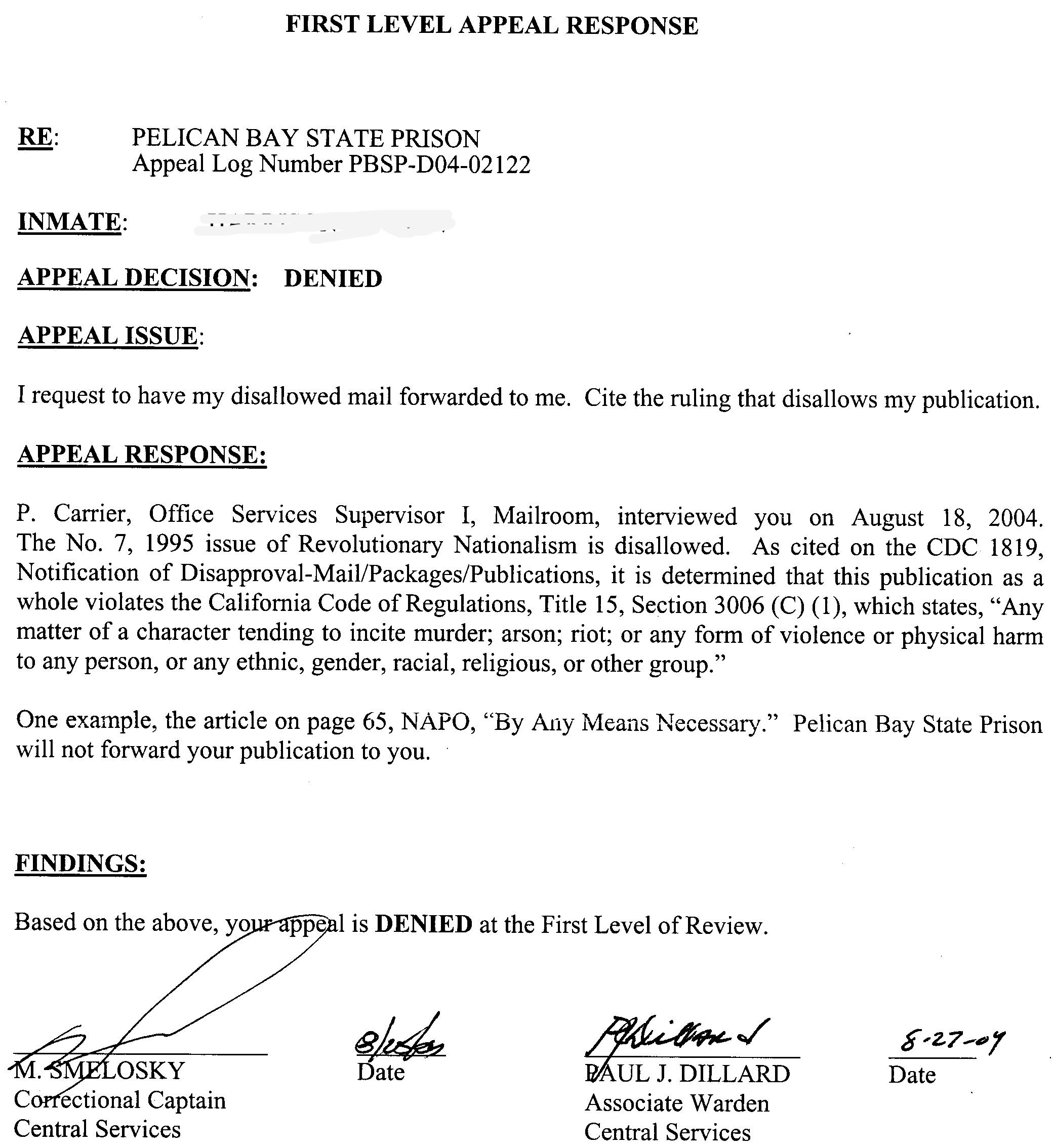 California, October 15, 2004 Second level review rejected - MIM Theory on revolutionary nationalism rejected to Pelican Bay (page 1)