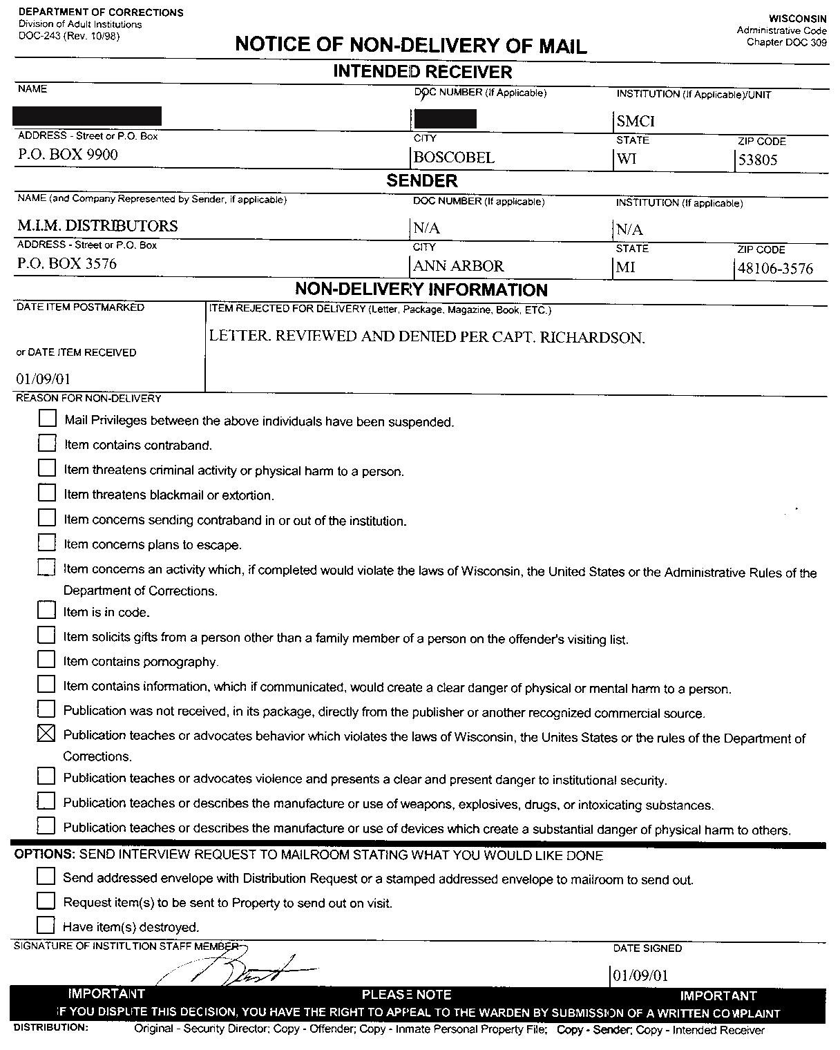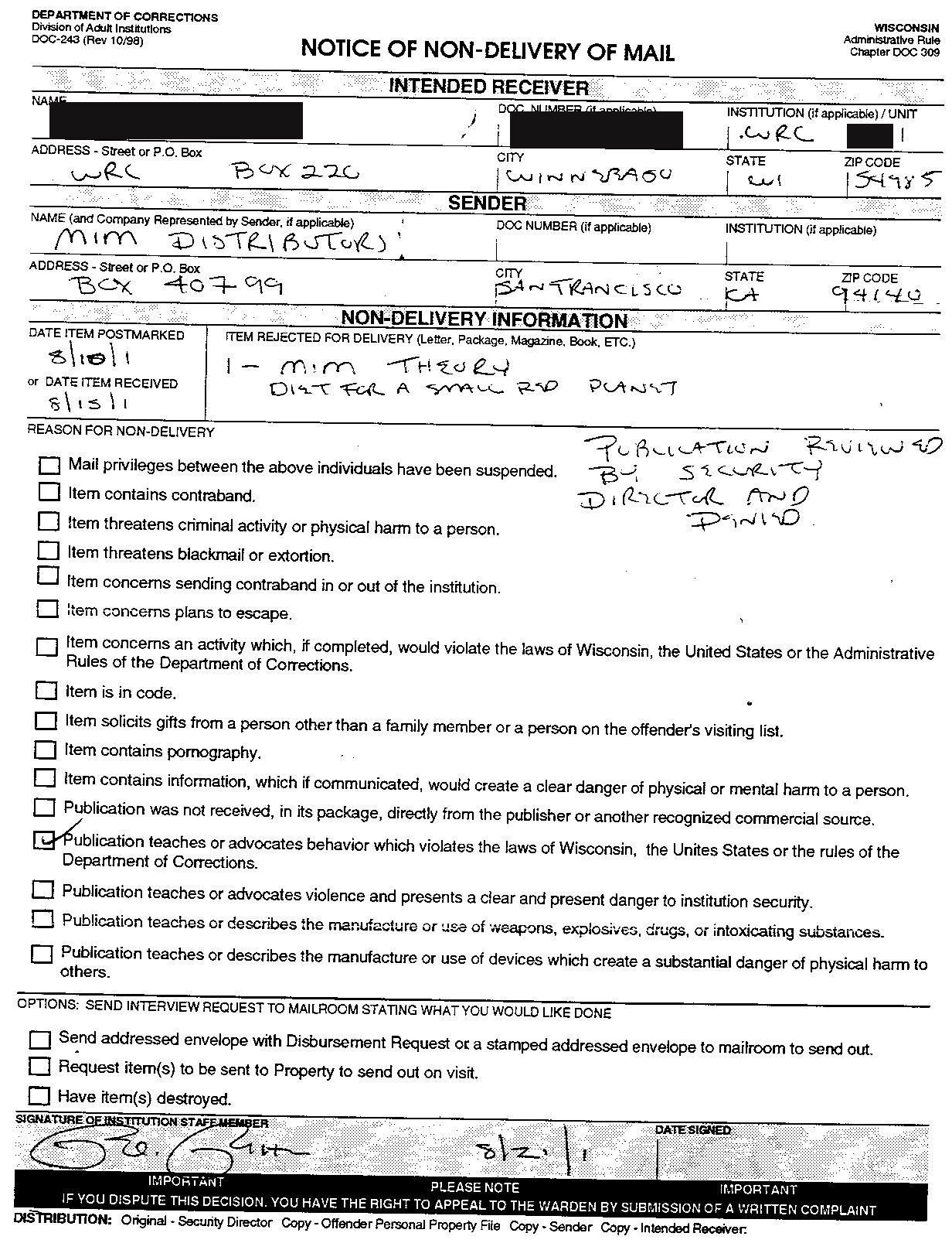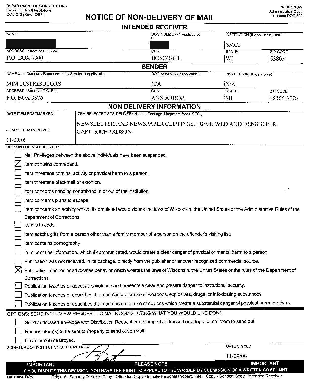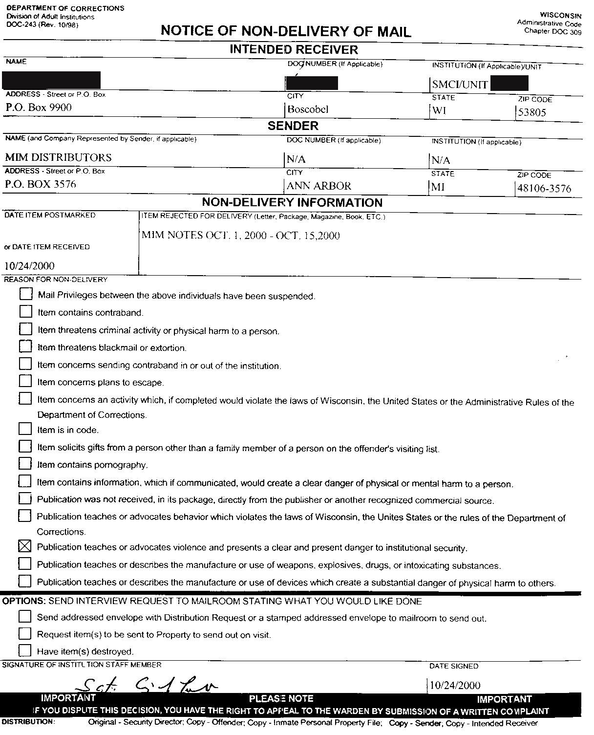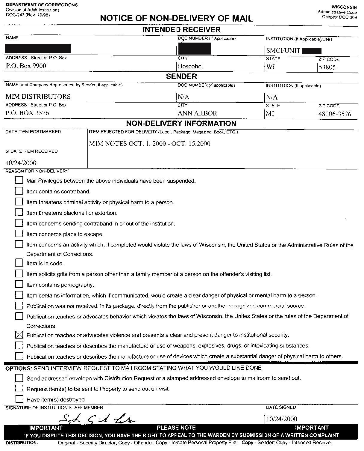 Wisconsin, October 2003 September 2003 MIM Notes rejected for: creating a clear and present danger to institutional security.