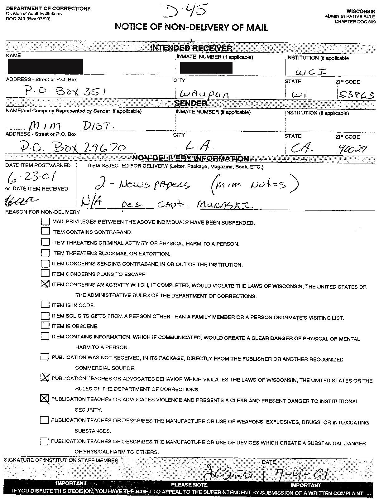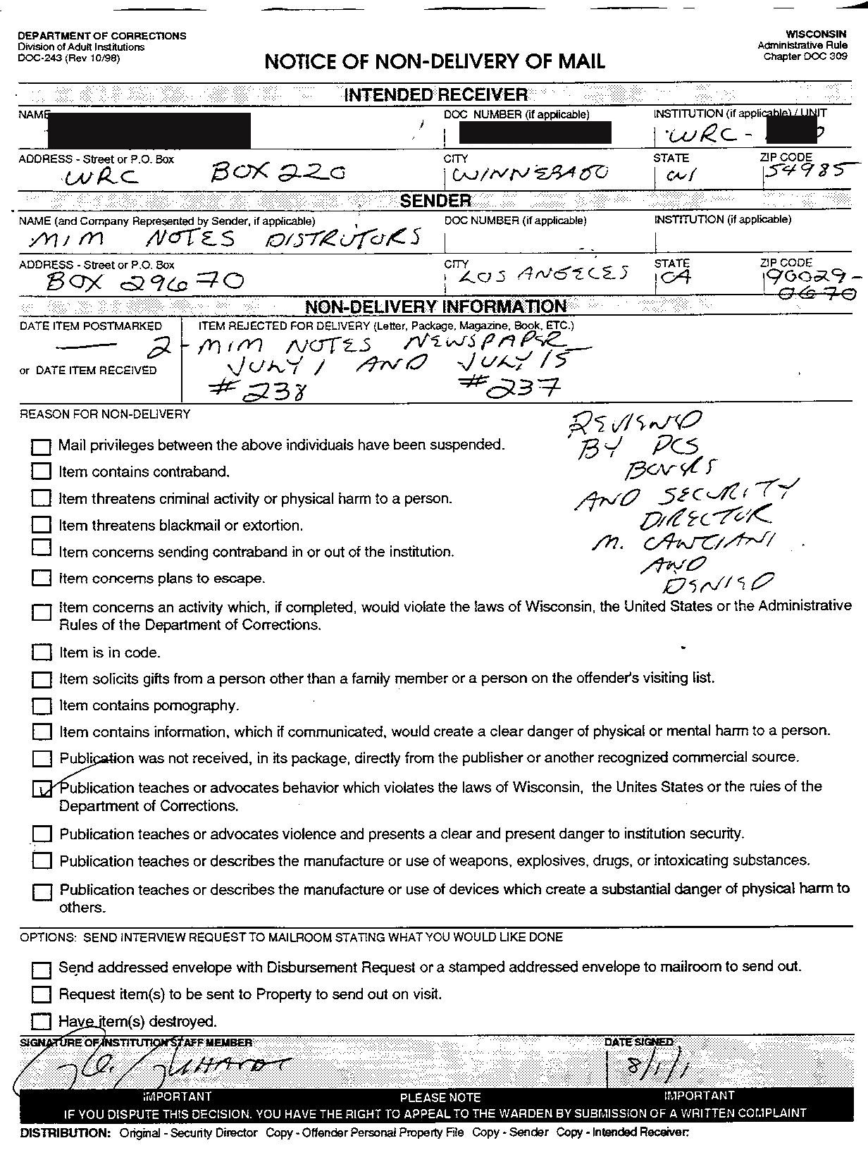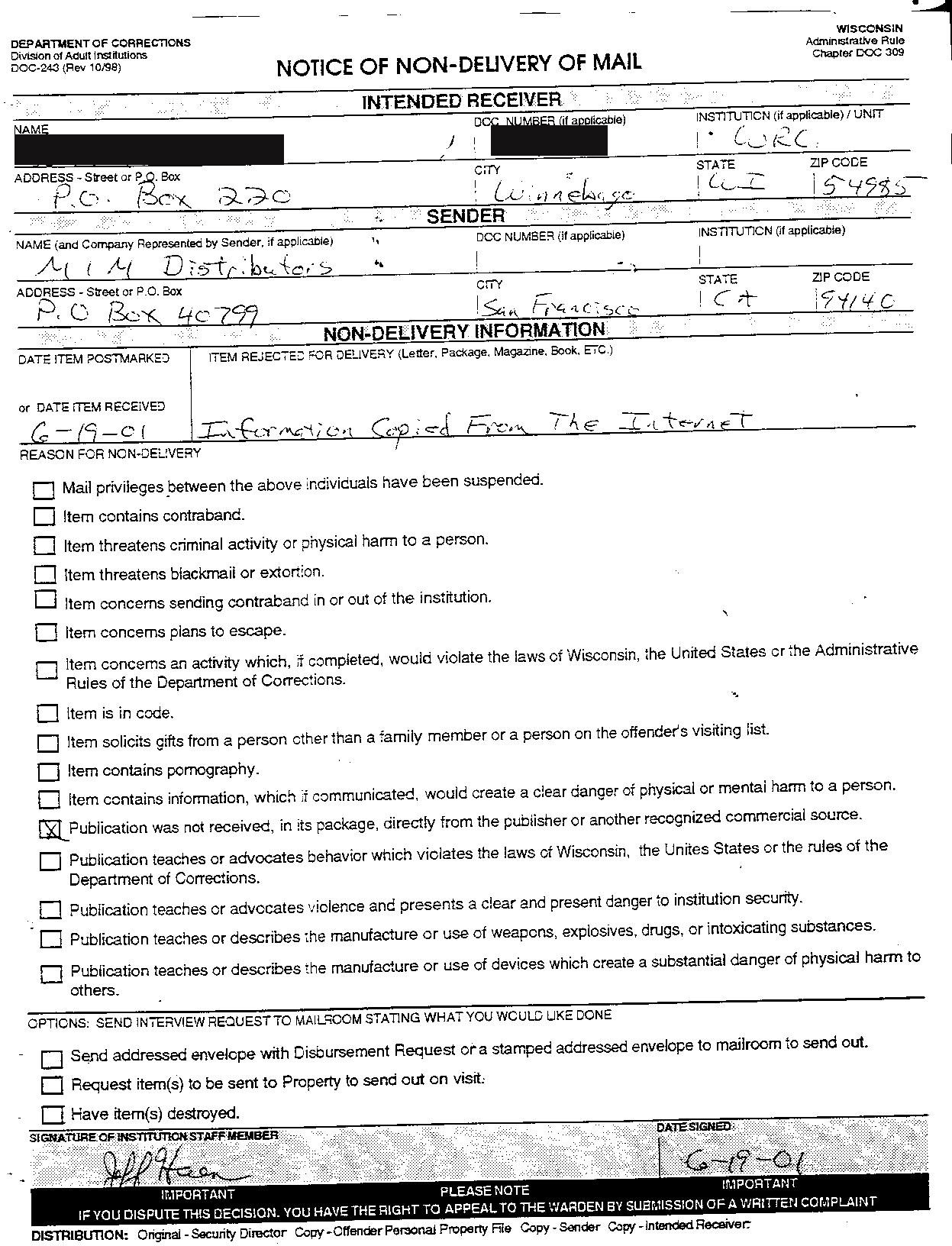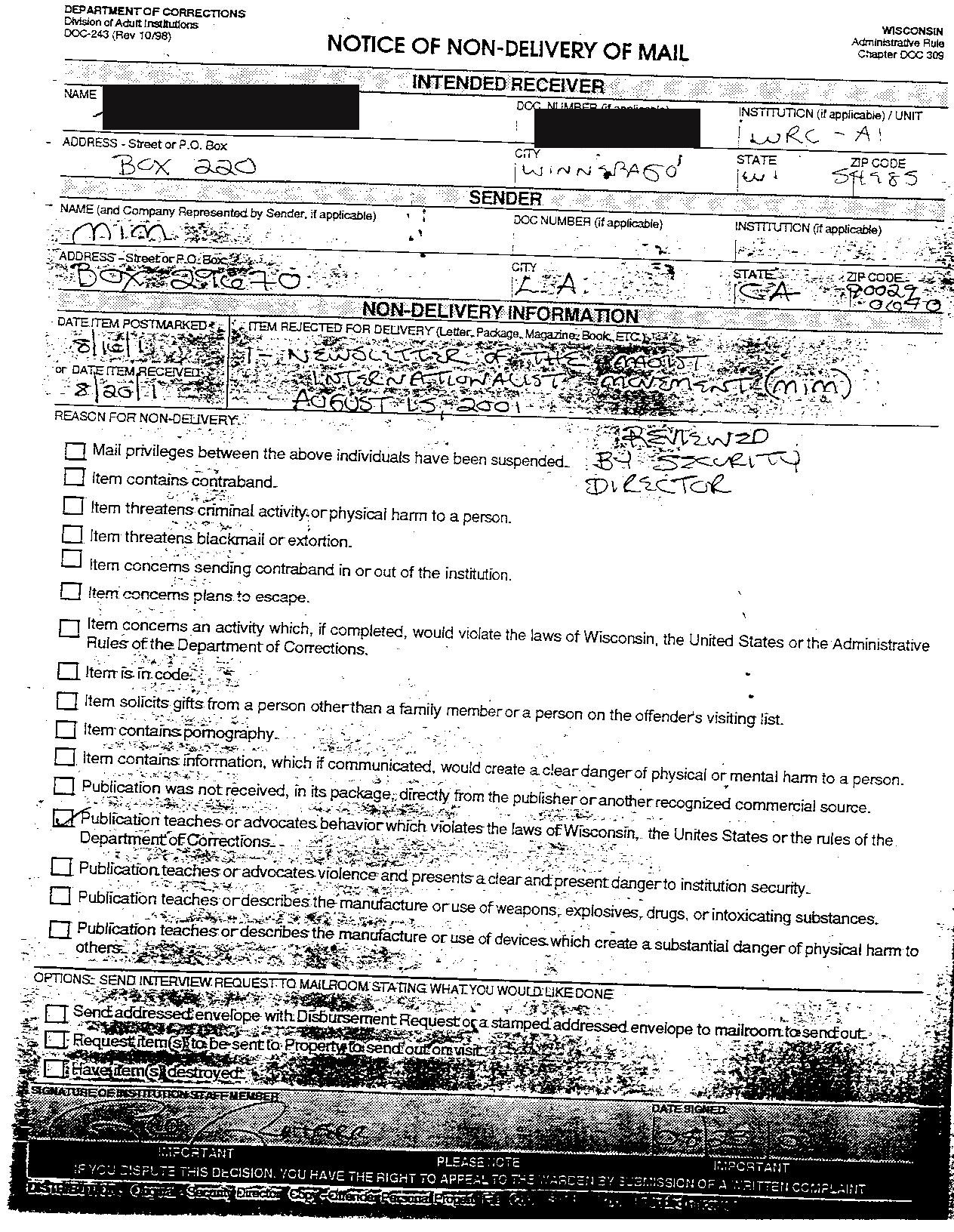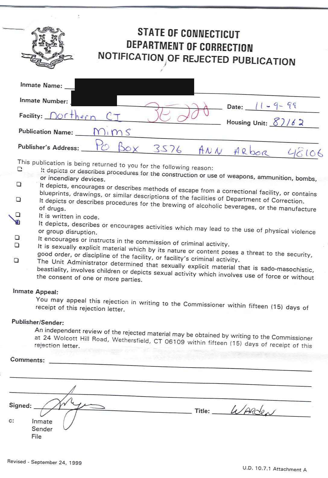 Wisconsin, October 2003 September 2003 MIM Notes rejected for: creating a clear and present danger to institutional security.