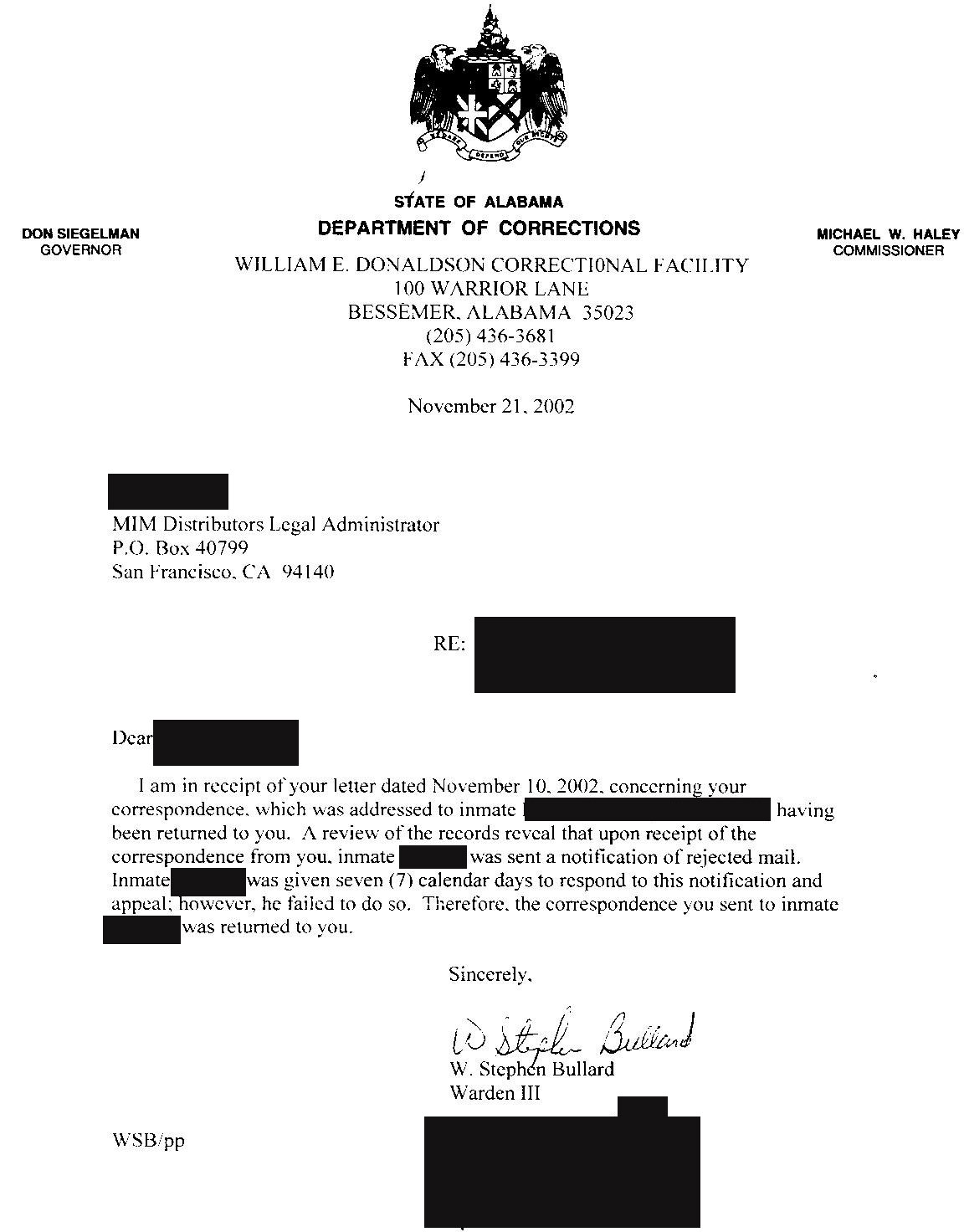 Limestone Correctional, Alabama, October 8, 2002 Rejection of MIM Theory #8 (200kb)