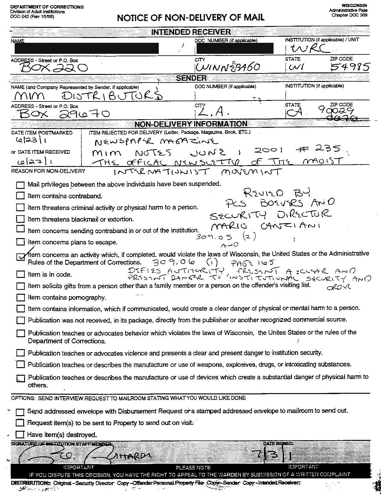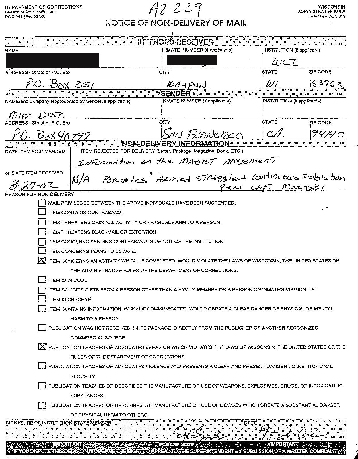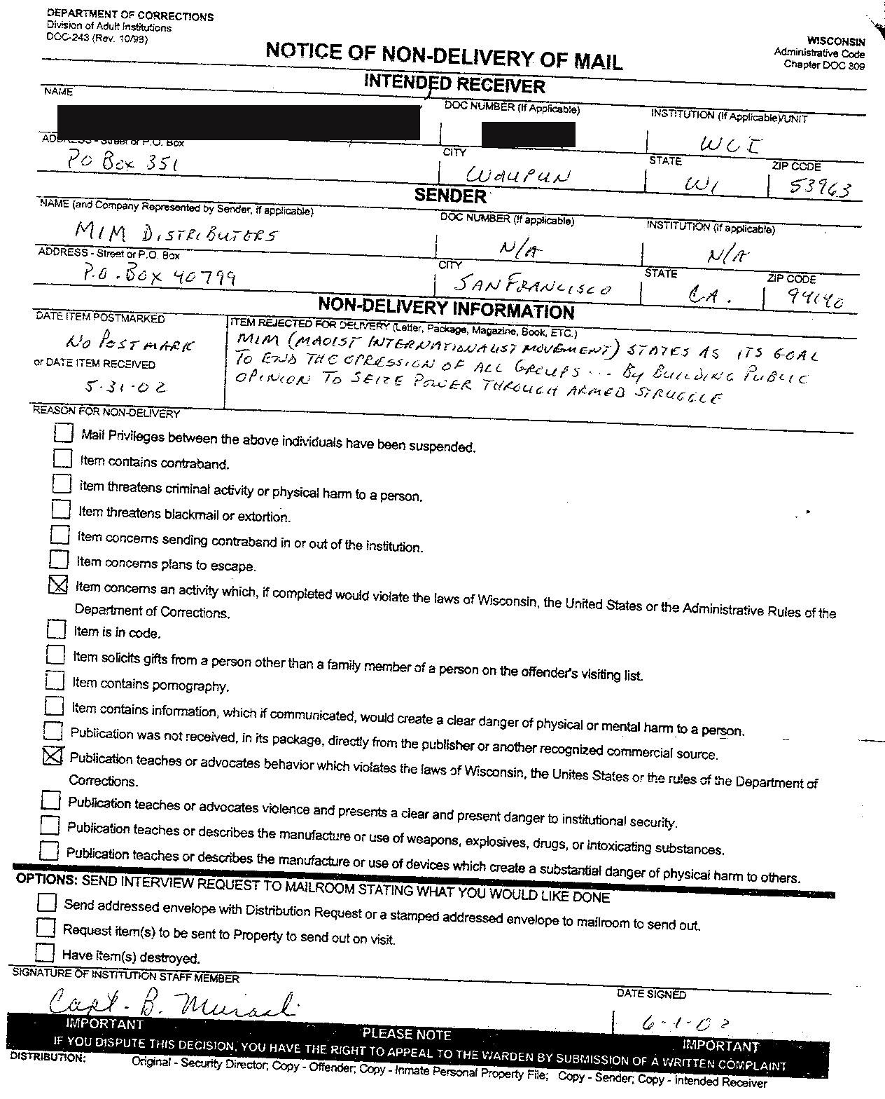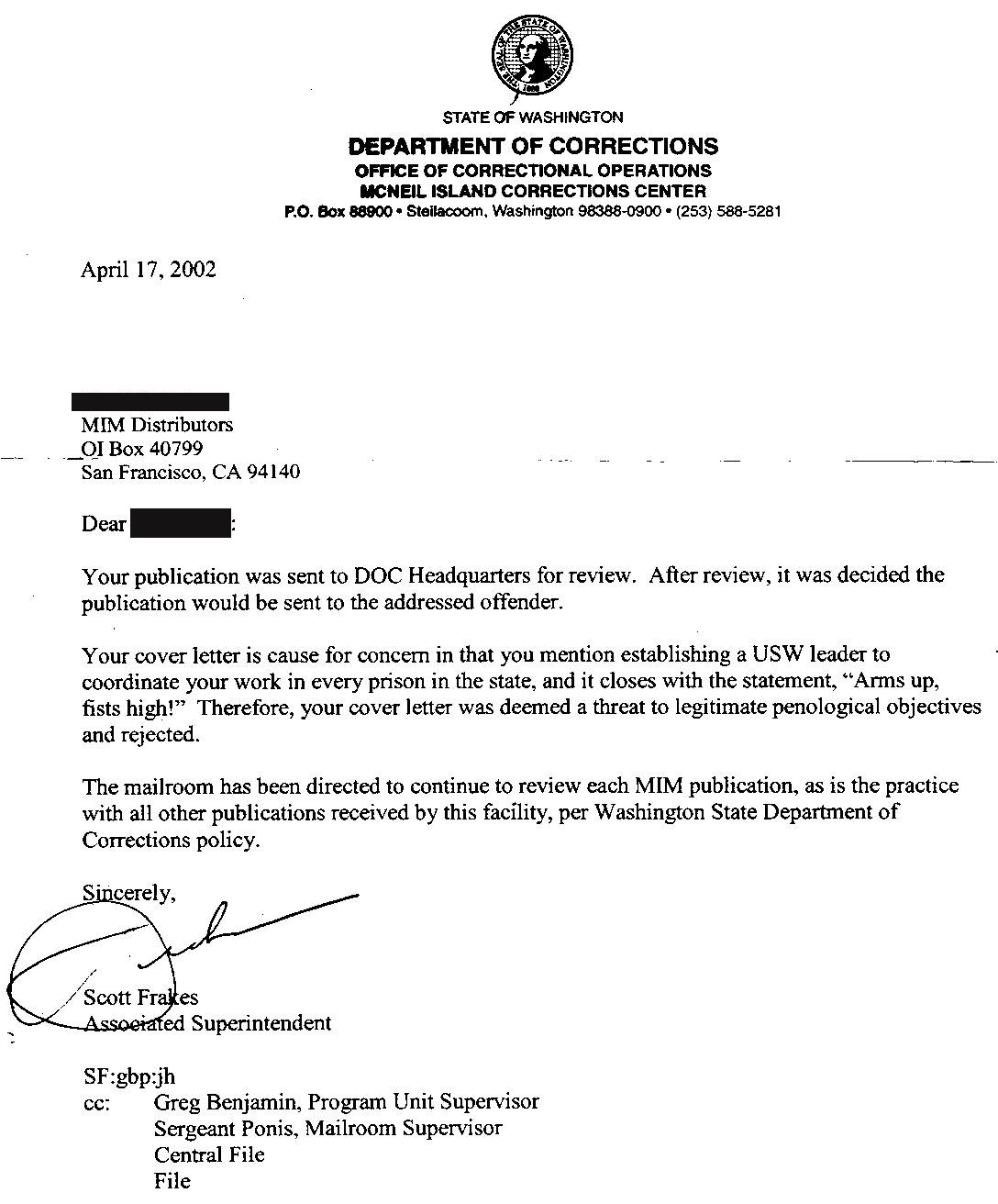 Washington, July 26, 2004 Letter protesting MIM Notes censorship is censored for mentioning another prisoner who was also censored