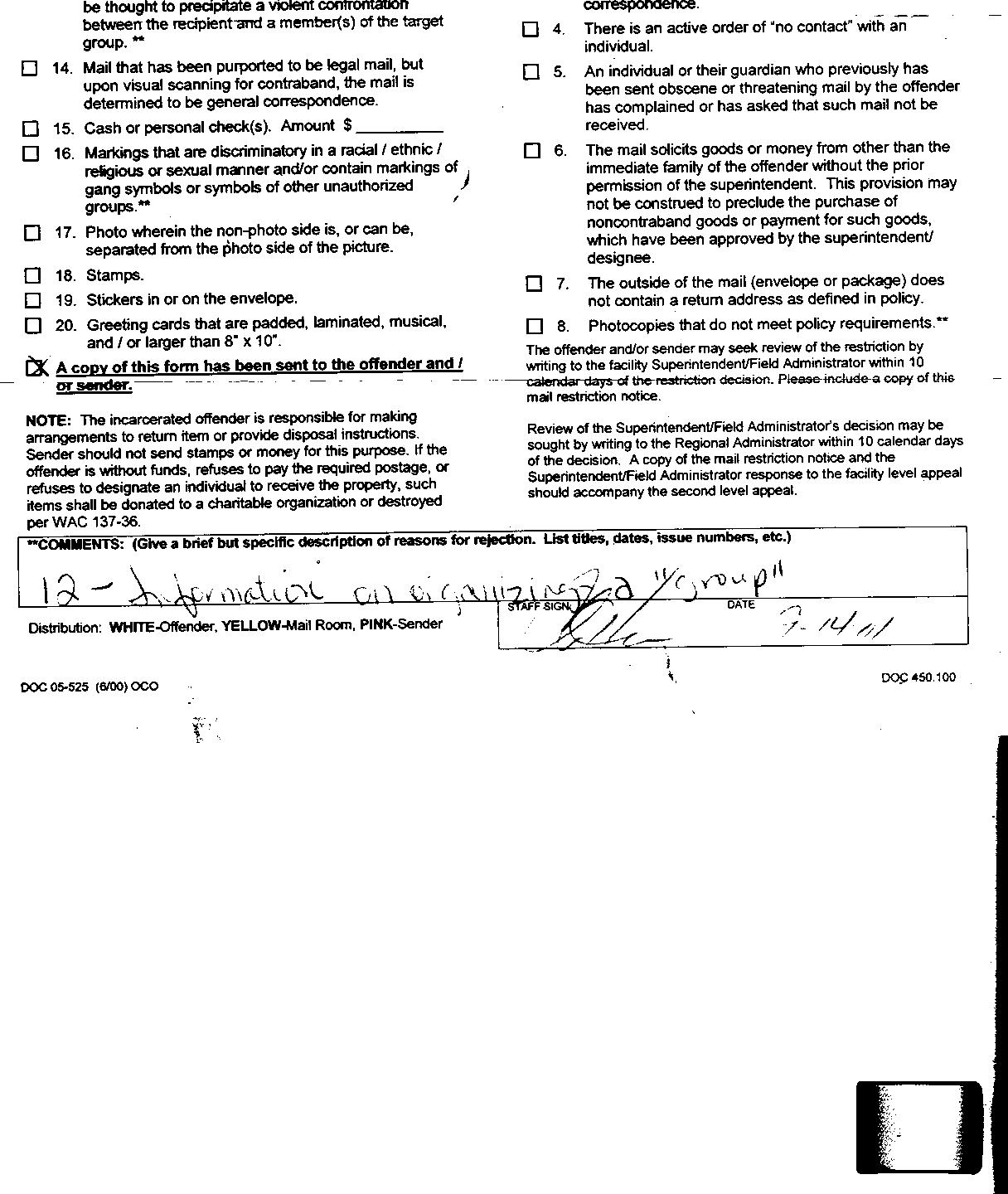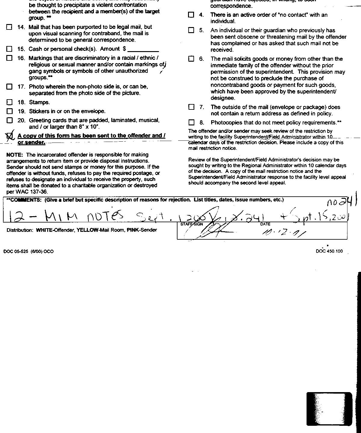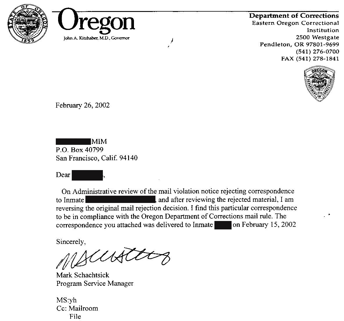 Oregon, March 12, 2002 Same rejection notice but for another inmate