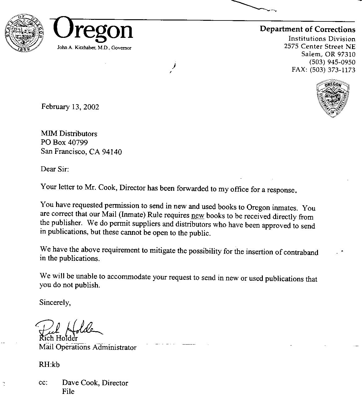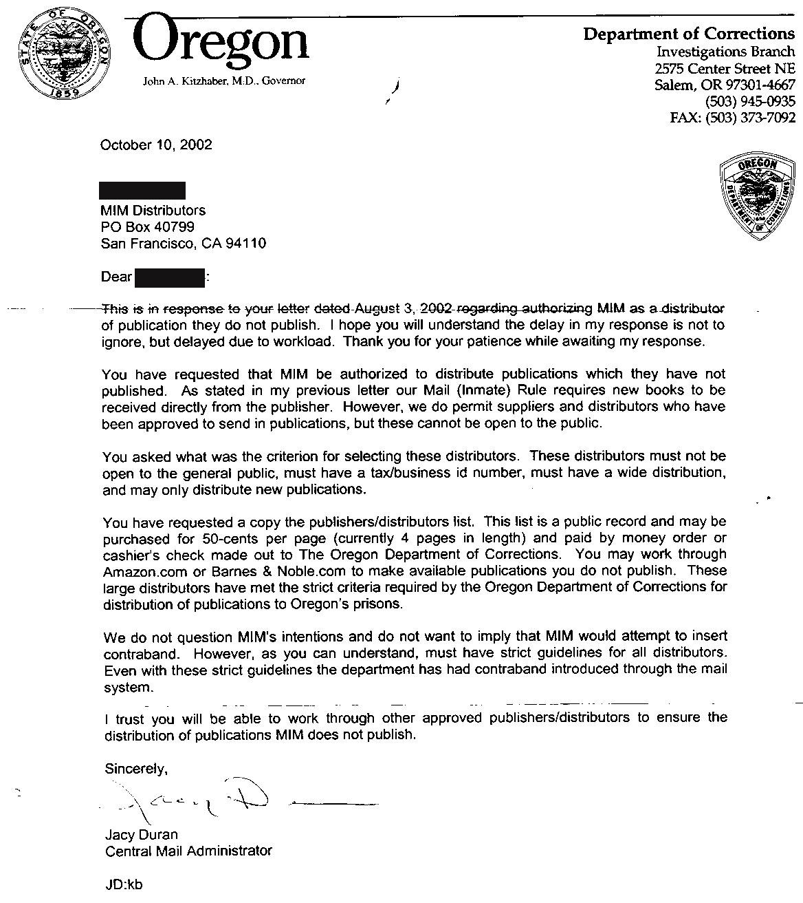 Oregon, March 18, 2002 Central Mail administrator: MIM not approved for literature distribution in prison