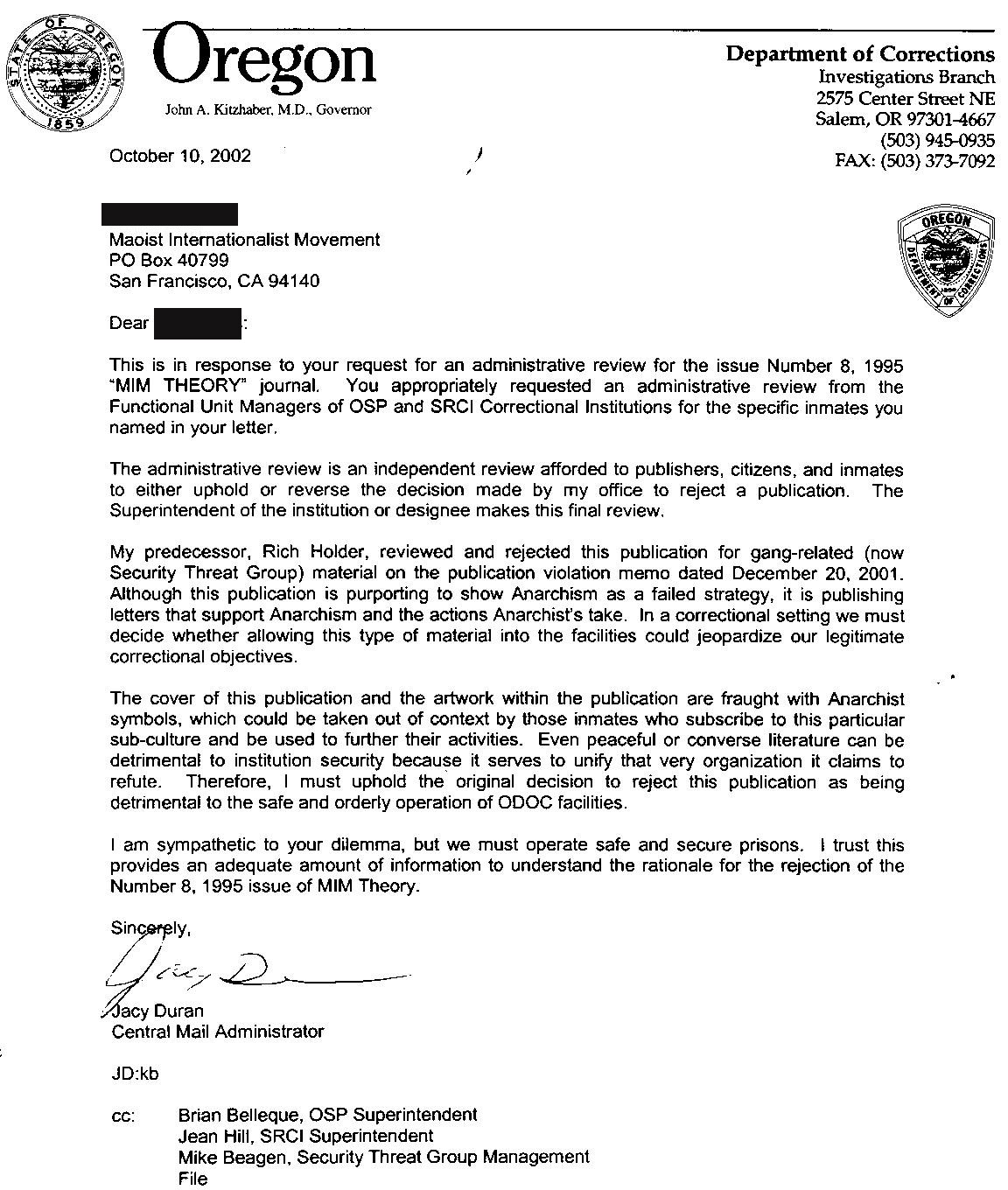 Oregon, September 3, 2002 Superintendent justifies banning MIM Theory magazine