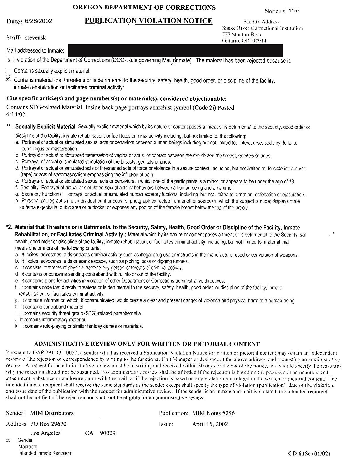 Oregon, July 25, 2002 Central Mail administrator: MIM not approved for literature distribution in prison