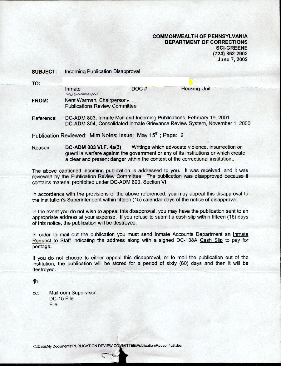 Pennsylvania, June 7, 2002 Camp Hill administrator upholds SCI Greene decision against MIM Notes