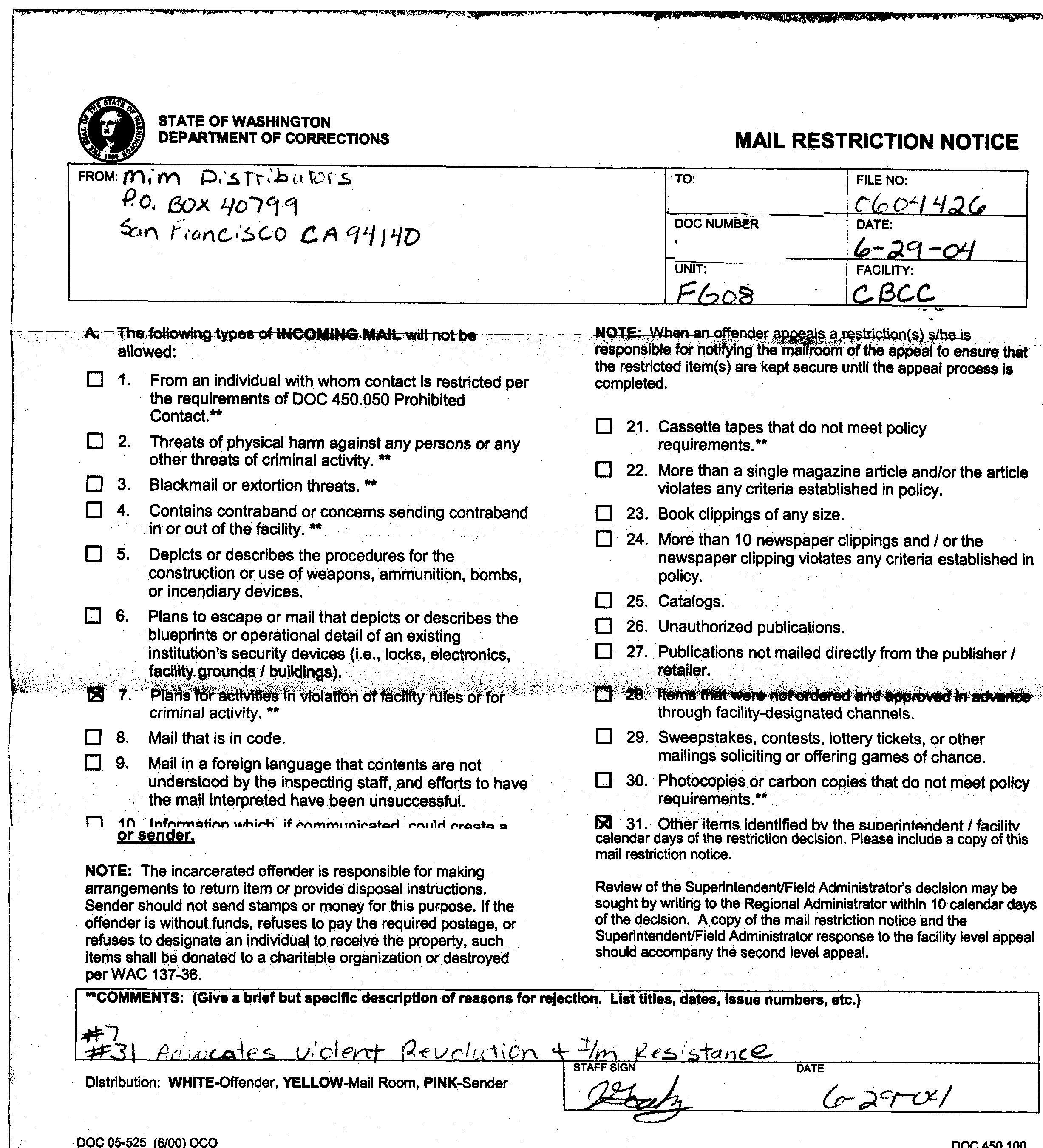Washington, June 29, 2004 MIM Notes, May 15, rejected as threat to penological objectives