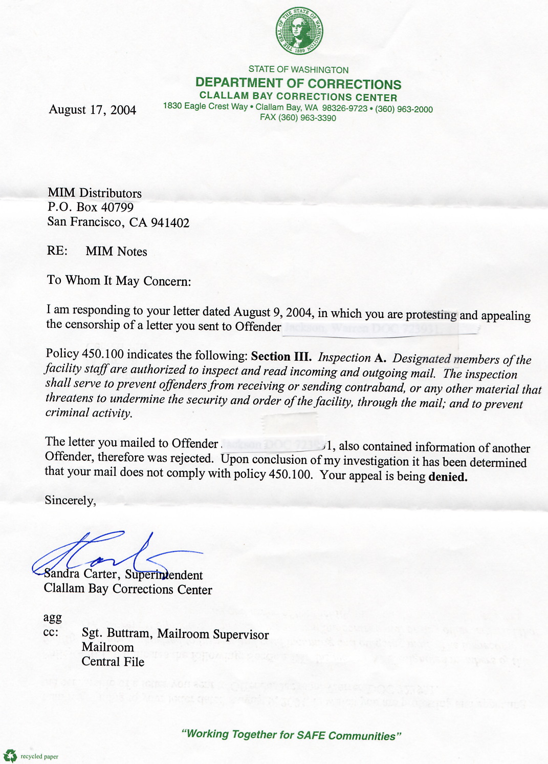 Washington, August 17, 2004 Superintendent upholds censorship of letter protesting censorship of MIM Notes