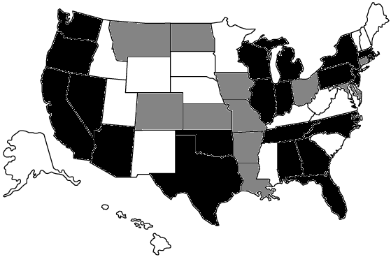 States known to have censored MIM-sent materials over the last year are colored black. Those known to have censored MIM in the six months prior to that are colored grey. Since prisoncrats don't always write to say they are censoring us, we can't say for sure other states aren't censoring.