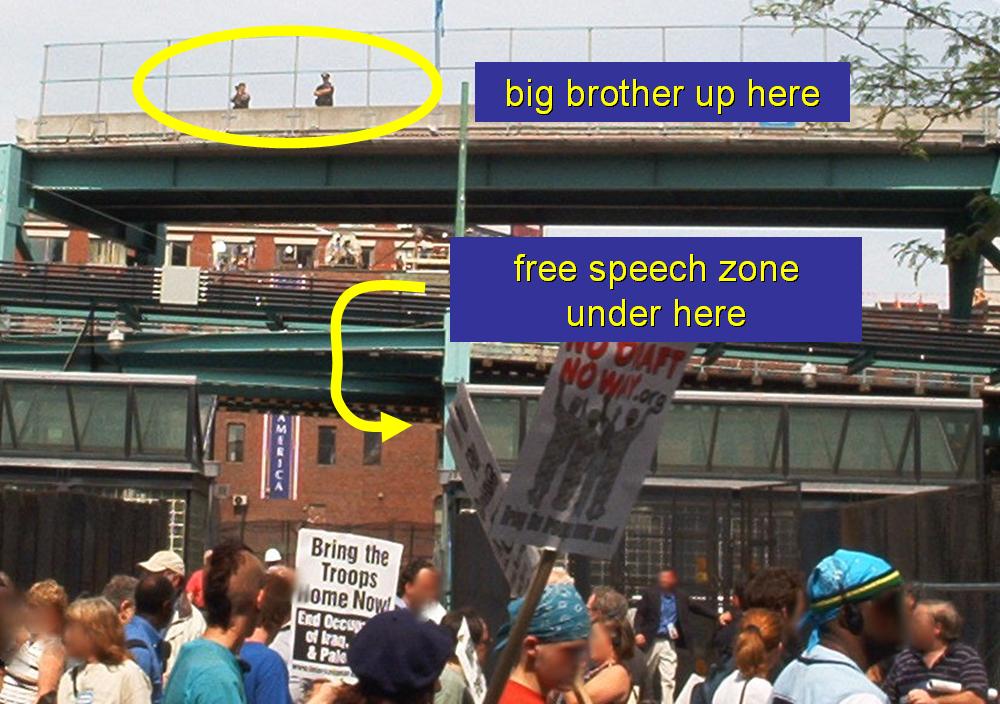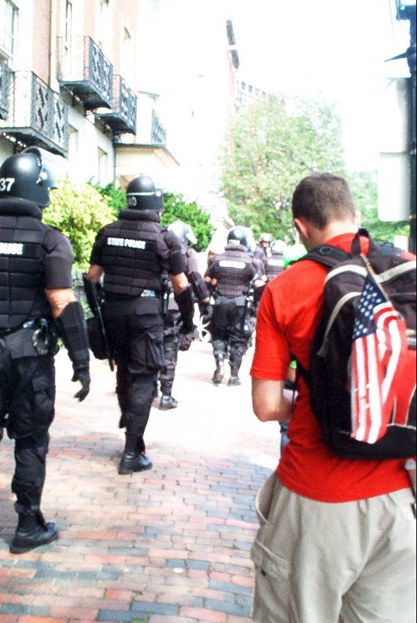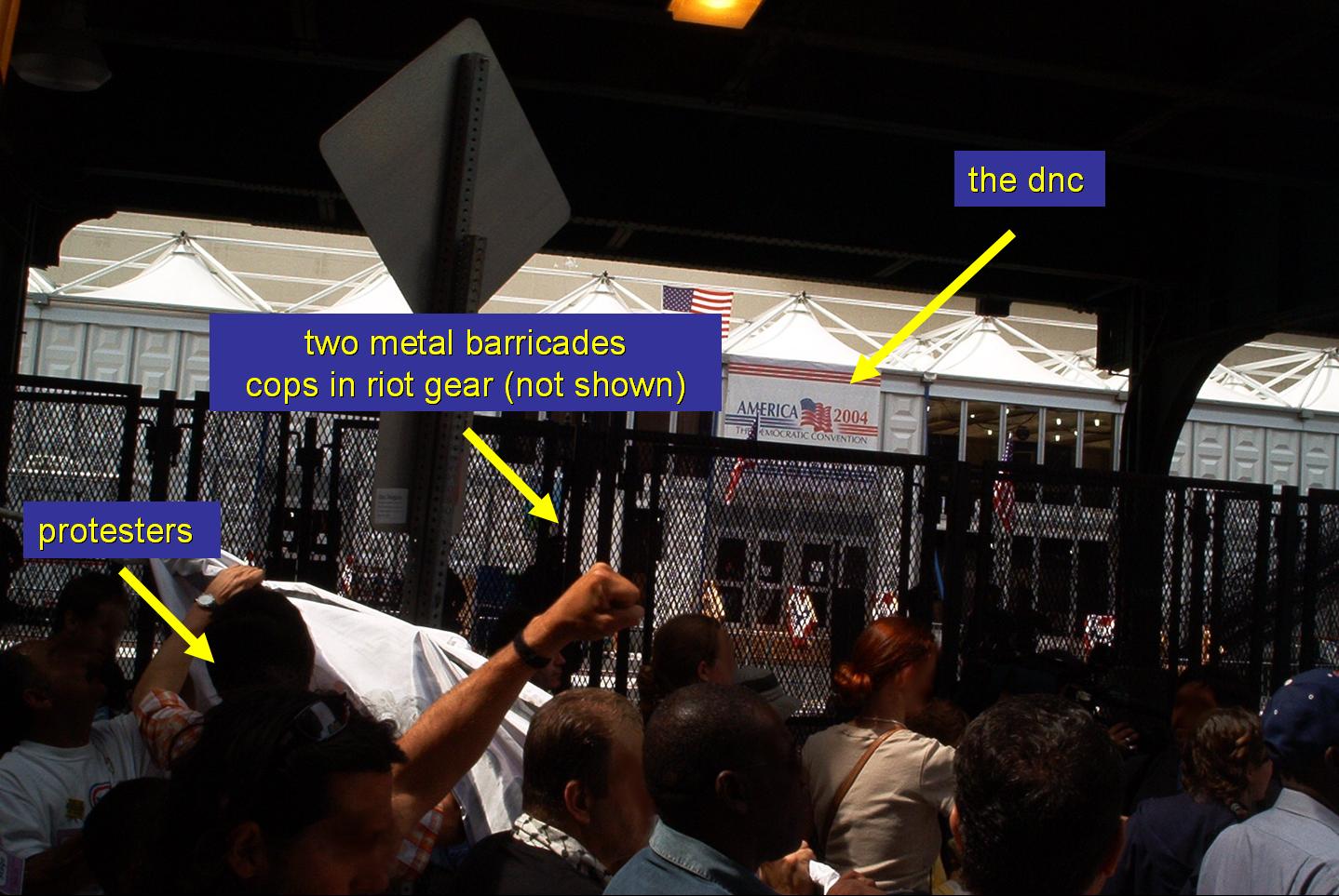 The march went by, but did not enter, the infamous "protest pen" set up by the City of Boston as a "free speech" area. This pen is surrounded on three sides by metal barricades topped by razor wire and covered by an abandoned rail line (seen here with police). Organizers sued to have the pen dismantled and a better site chosen, calling it an "internment camp." A judge denied their request, at the same time noting, "One cannot conceive of what other elements you would put in a place to make a space more of an affront to the idea of free expression than the designated demonstration zone."