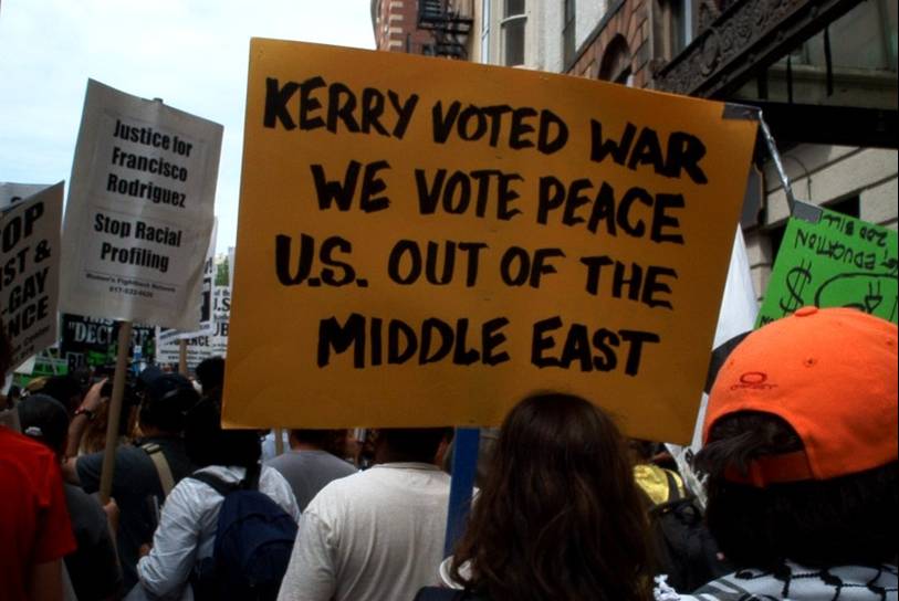 The overwhelming majority of protesters shared this womyn's opinion of Democratic presidential candidate John Kerry. A speaker at the kick-off rally pointed out that Kerry has called for more U.$. troops in Iraq, increased funding for Special Forces, and believes the occupation of Iraq should continue for the rest of the decade. However, even though the "anybody but Bush" crowd stayed away from this march, there was still a range of political trends present; electoral politics was by no means absent. Some marchers were DNC delegates, hoping to influence the Democrats' program "from the outside." Others supported third-party candidate Ralph Nader (apparently taking an "Anybody but Kerry or Bush" line).