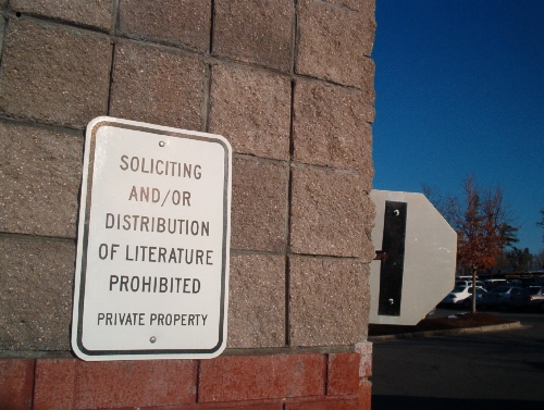 Malgré nombreuses décisions juridiques contre des centres commerciaux, aéroports, voire barbecues en arrière-cour qui invitent le public à la propriété puis affirment un droit à museler le public, les propriétaires nient encore régulièrement la nommée liberté d'expression. La loi qui dit que le public ne cède pas ces droits sur propriété privée n'est pas mise en vigueur. Au lieu d'encourir des amendes de millions de dollars et l'emprisonnement comme il faudrait, les propriétaires des centres commerciaux se contentent du fait que seulement les voleurs de la crème glacée sont emprisonnés à vie en Californie.