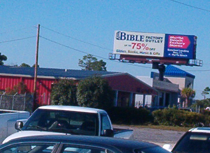 The sign reads: "Bible Factory Outlet: 75% off." As long as capitalists can make a profit, they don't