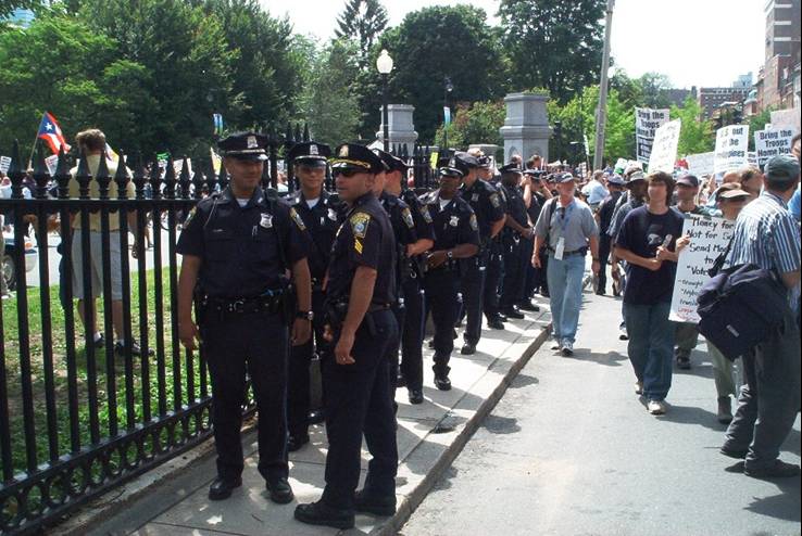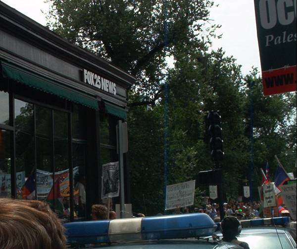 Protesters marched past the Fleet Center, site of the Democratic National Convention (DNC) despite FBI and police harassment before the event and a police-state atmosphere that included the threat of random bag searches on public transportation. Organizers insisted on their right to march past the DNC and succeeded in securing a permit just hours before the scheduled start time.